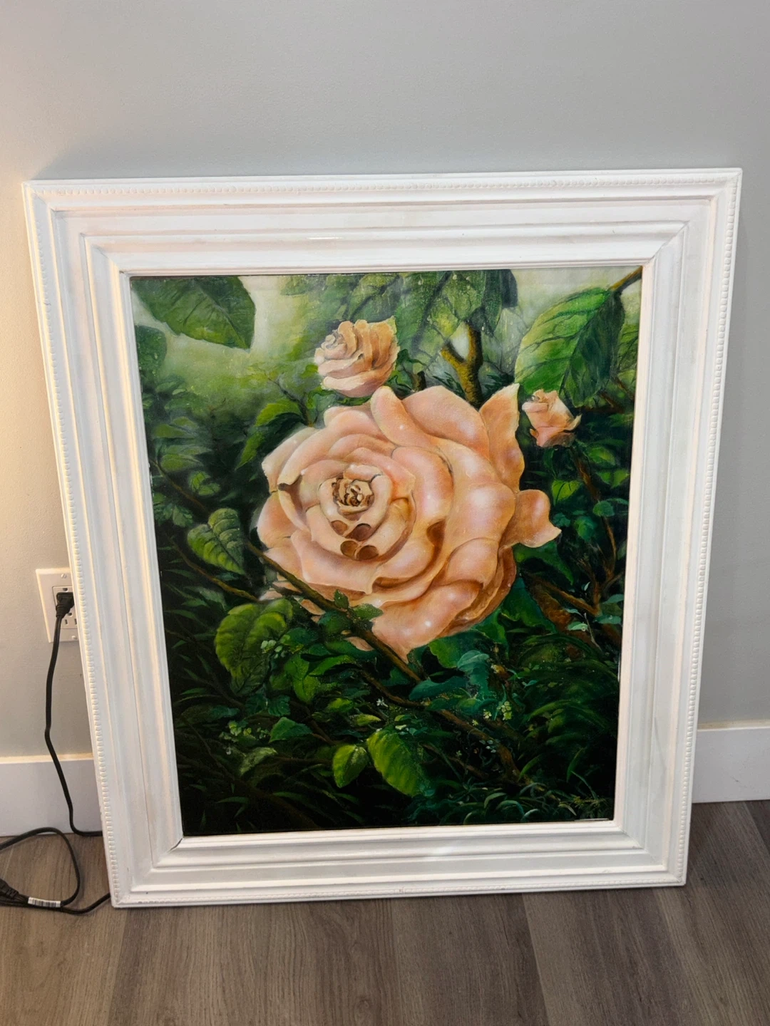 23Beautiful rose oil painting with a white frame! It's a lovely piece that would brighten up any room. The colours are vibrant and the detail is quite nice