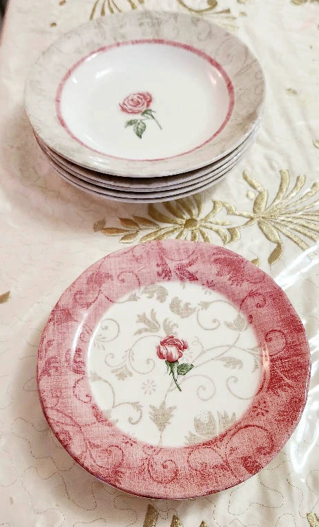 Selling a set of 10 decorative plates. They feature a delicate rose pattern in shades of pink and cream. Perfect for adding a touch of elegance to your table setting or as decorative pieces around the house!