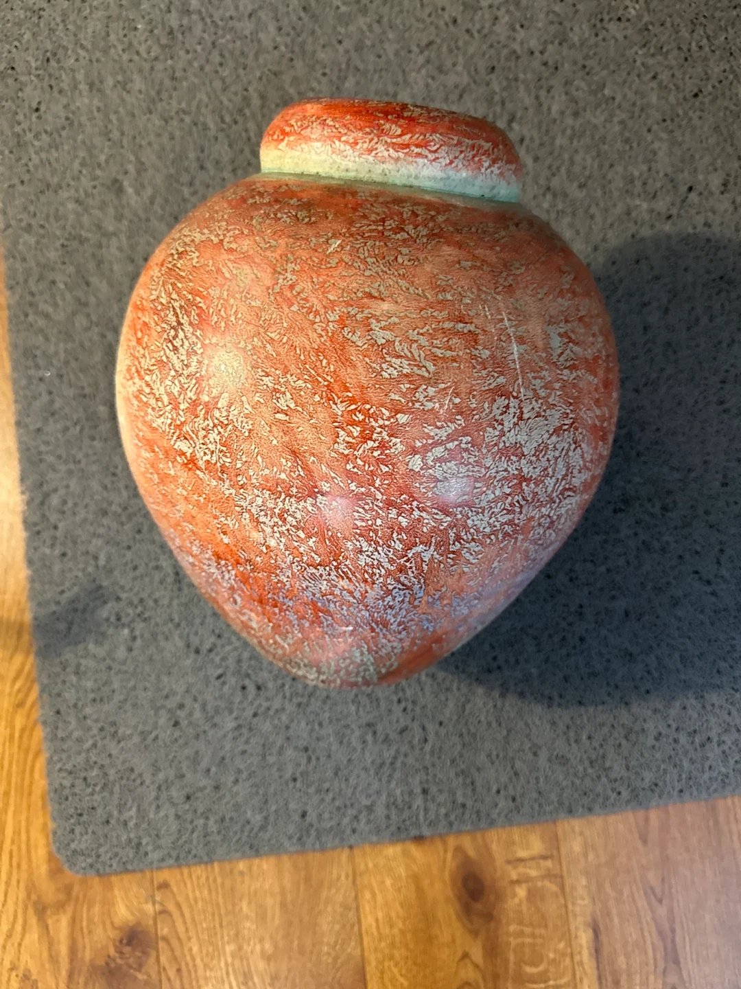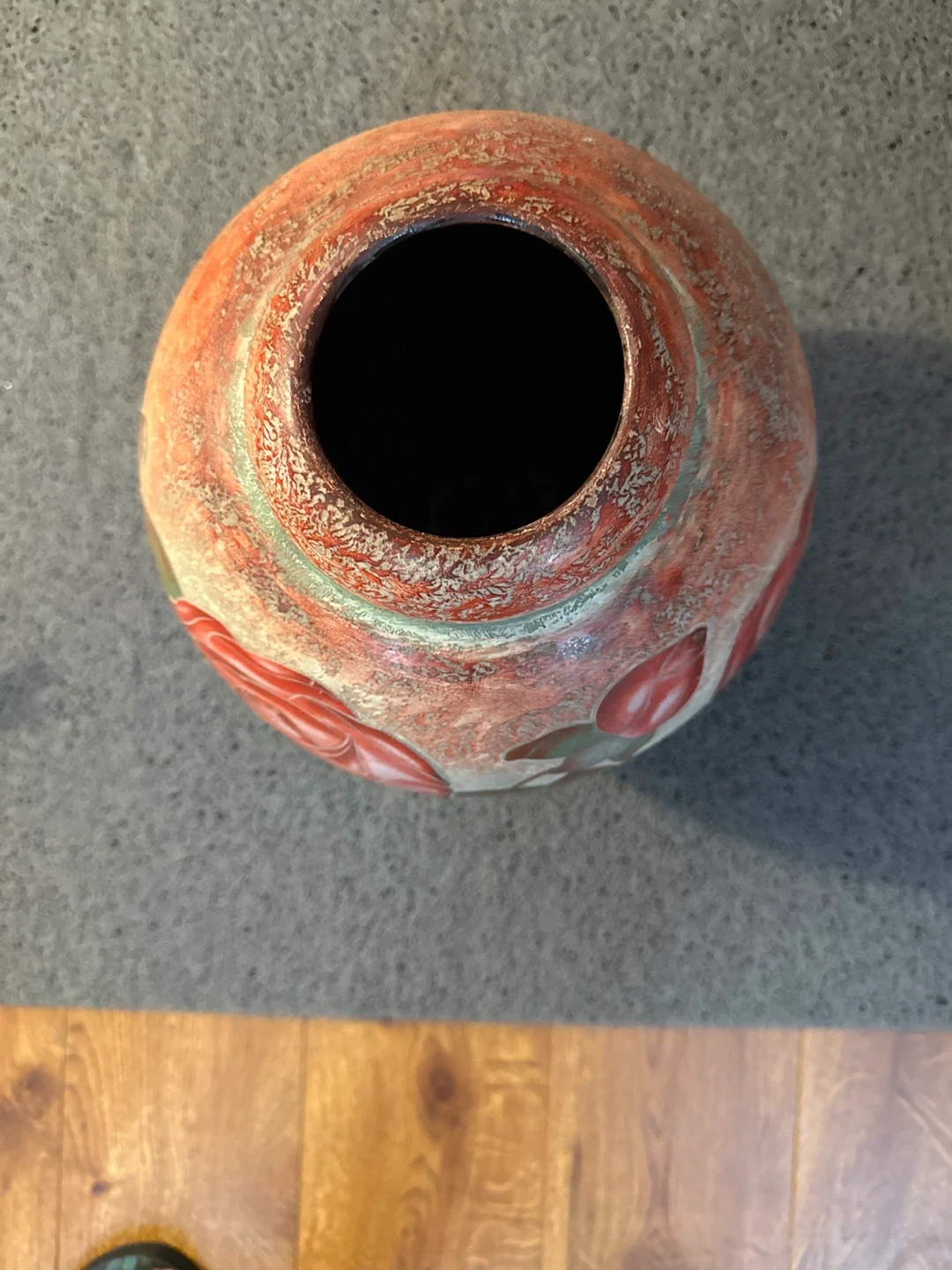 258Beautiful rose patterned vase in shades of red, green, and cream. It would look great as a centrepiece or accent in any room!