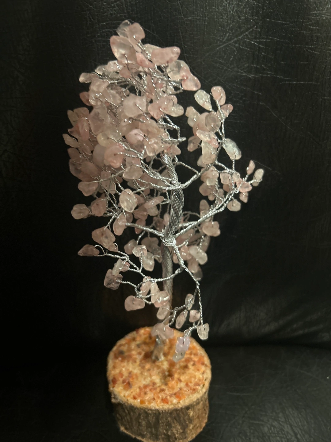 A beautiful rose quartz crystal tree, set into a round of tree cutting, these are energy and healing stones / as I clear much of the smaller goods these are being offered out, pet and smoke free home