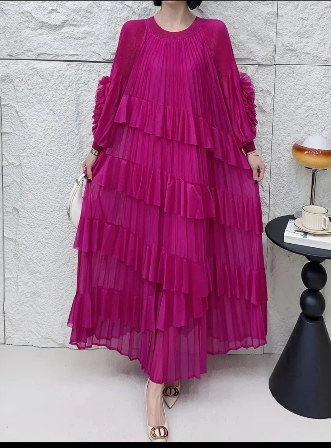 Selling a beautiful rose red dress with a unique pleated design. It's an Asian one-size, so it should fit a range of sizes. The dress features lovely ruffle details on the sleeves and a tiered skirt. Perfect for a special occasion or a stylish everyday look!