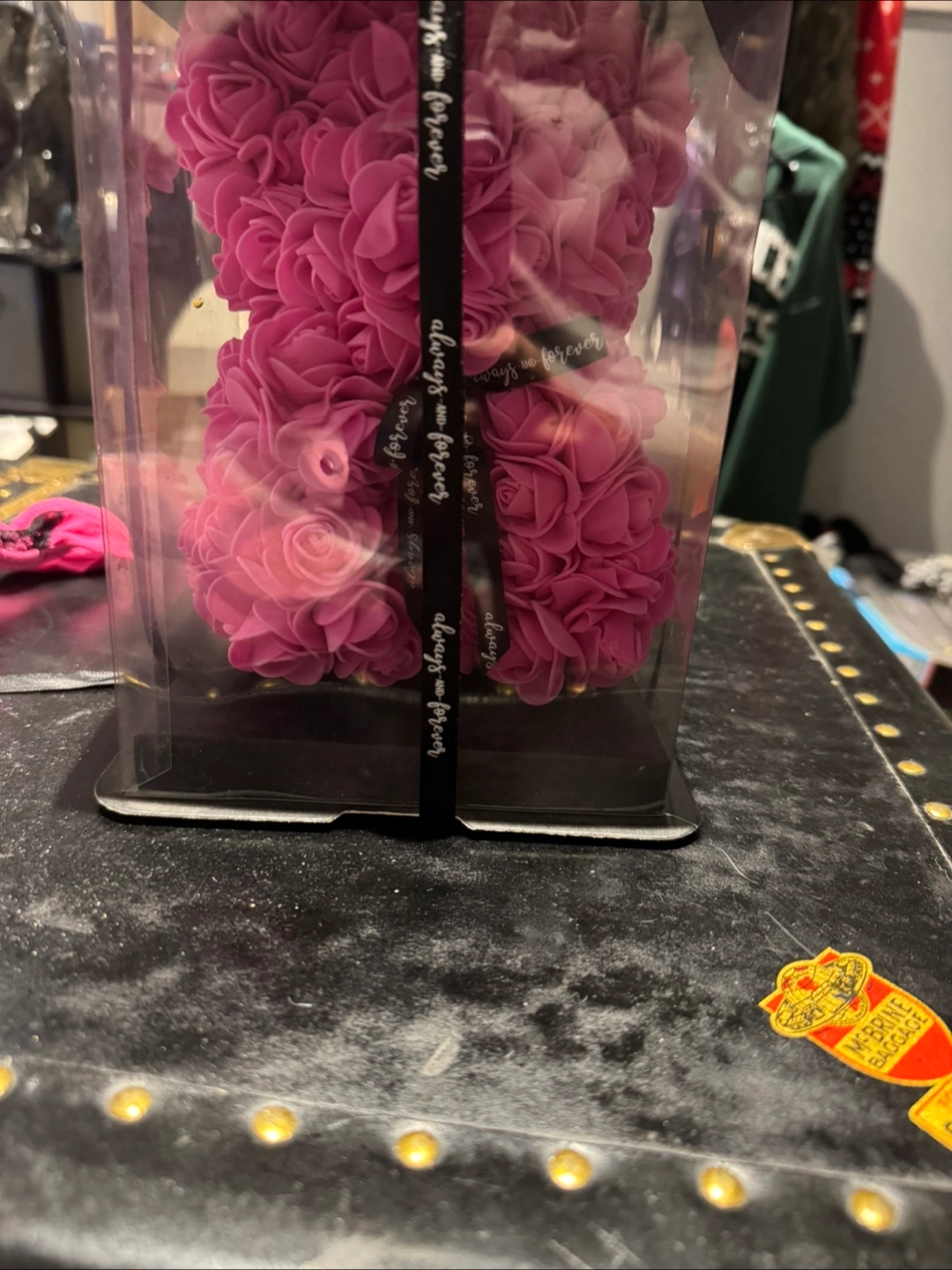 Selling a cute rose teddy bear, it's in a clear display case with a ribbon that says 'always and forever' wrapped around it