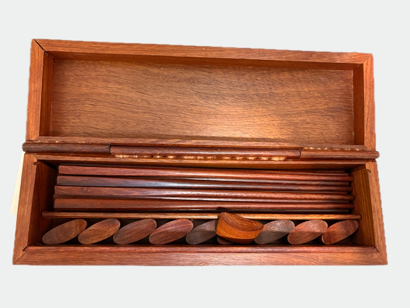 Selling a wooden game set that comes in a wooden box. The Cherrywood set is in good condition and has a beautiful wood grain finish. Perfect for family game nights or as a decorative piece for your home! I am adding 3 sets of metal chopsticks and 5 metal straws free.
