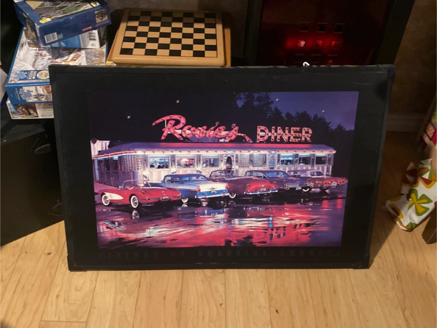 Framed print featuring Rosie's Diner from the "Visions of Roadside America" series. It's a cool piece of art for anyone who loves classic diners and vintage cars! need gone asap will negotiate price