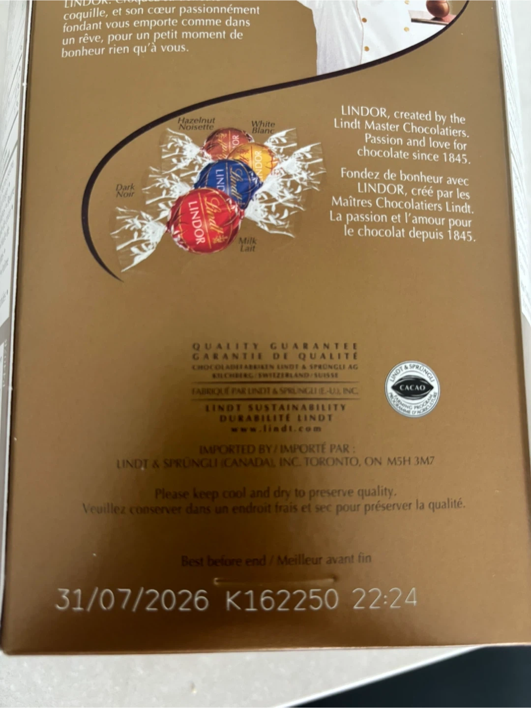 Assorted Lindt Lindor chocolate balls with smooth centres. Features four flavours: Milk, Dark, White, and Hazelnut. Best before end date of 31/07/2026. This box is perfect for sharing or enjoying on special occasions!