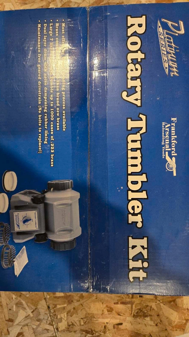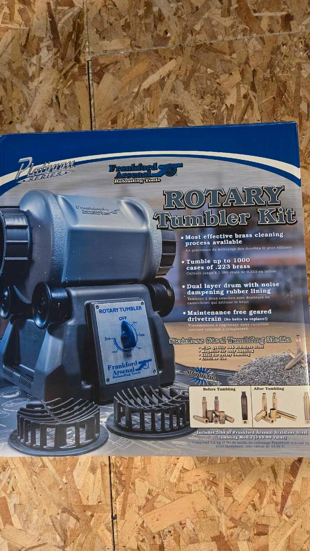 This is a brand new, never opened, Frankford Arsenal Platinum Series rotary tumbler kit. Tumble up to 1000 cases of .223 brass with this kit. It features a dual-layer drum with noise-dampening rubber lining and a maintenance-free geared drivetrain. I've had this kit sitting around, waiting for its moment to shine, but alas, it's time to pass it on to someone who'll truly put it to use. Rest assured, if the ad is still up, the kit is available! I will price it at $280 CAD.
