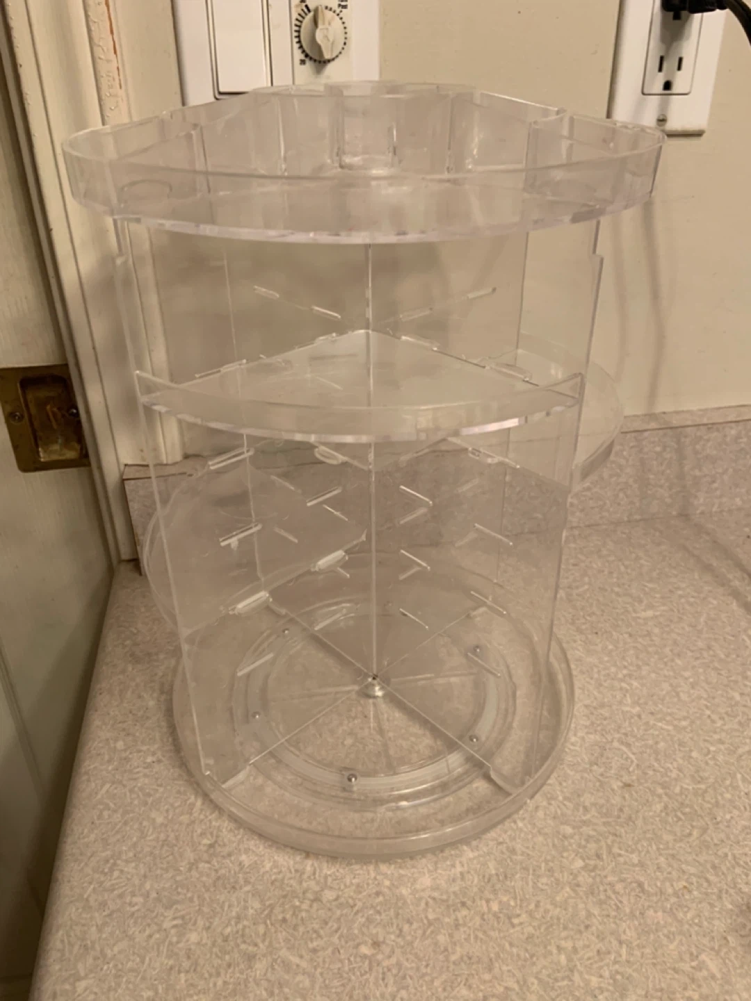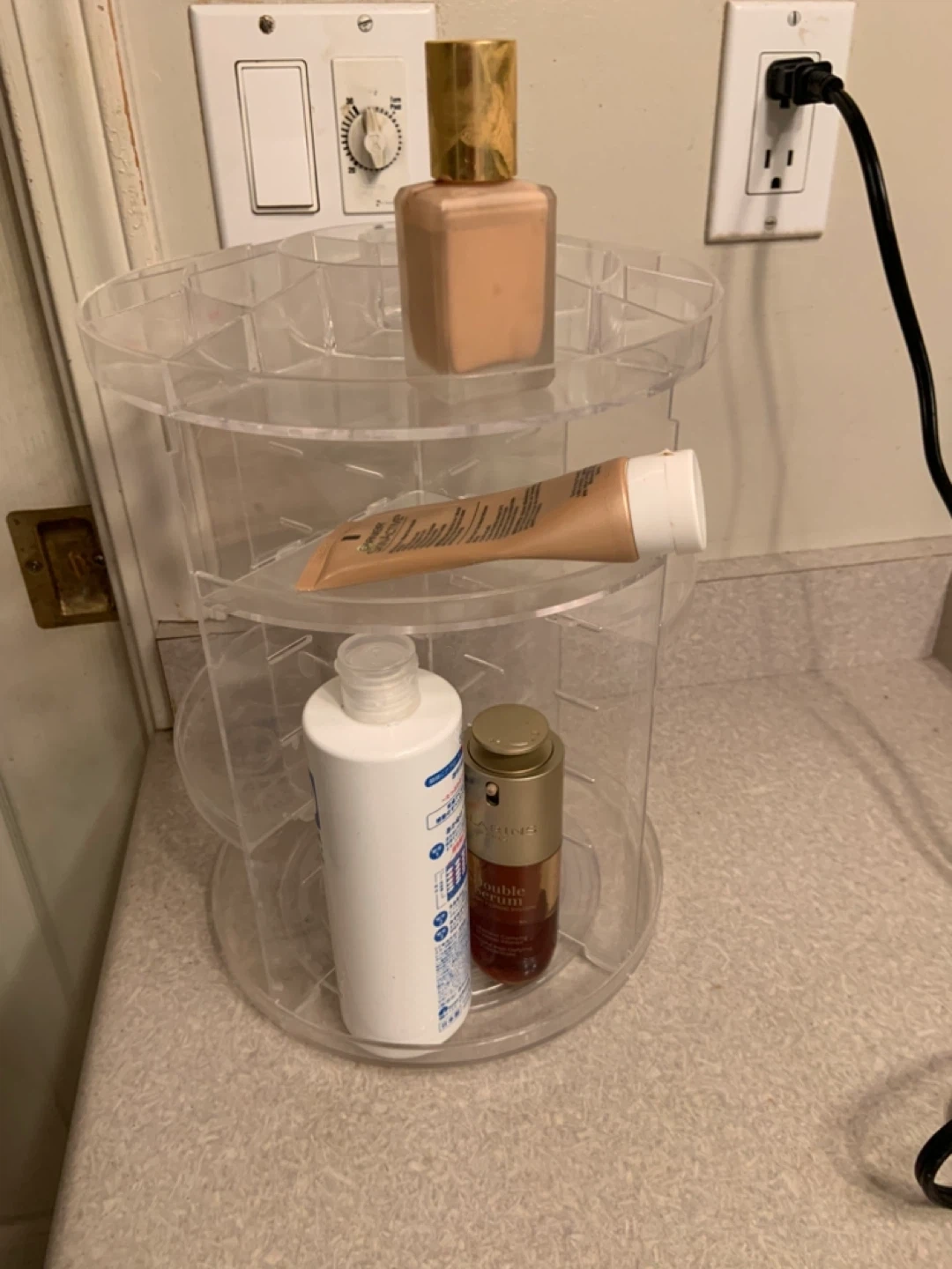 Selling a clear rotating makeup organizer! It's perfect for keeping all your beauty products neat and tidy on your vanity or bathroom counter. It has multiple tiers for storing different sized items, and the rotating design makes it easy to access everything you need