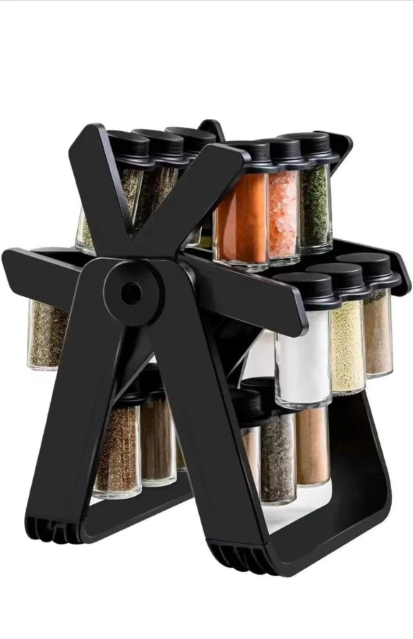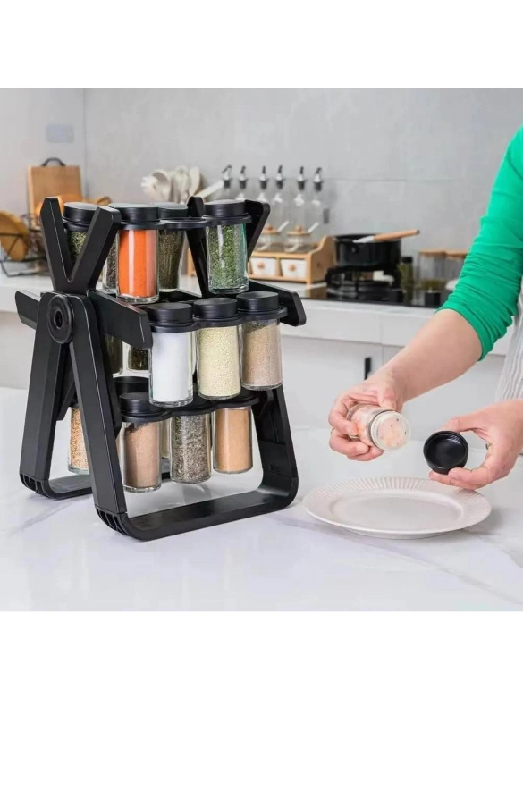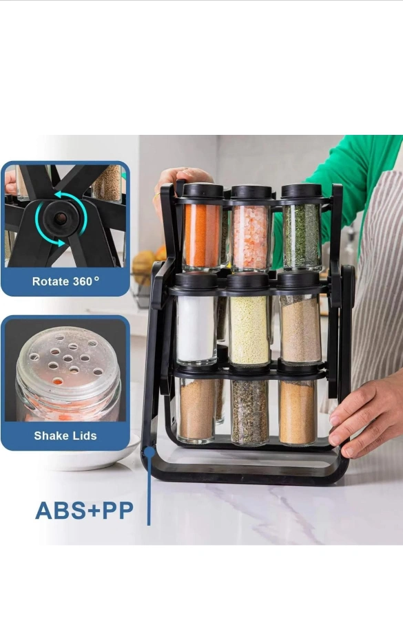 10Keep your spices organized with this rotating spice rack! It holds multiple spice jars, making it easy to find what you need. The rack rotates 360° for convenient access. The spice jars have shake lids for easy dispensing. Made with durable ABS+PP material