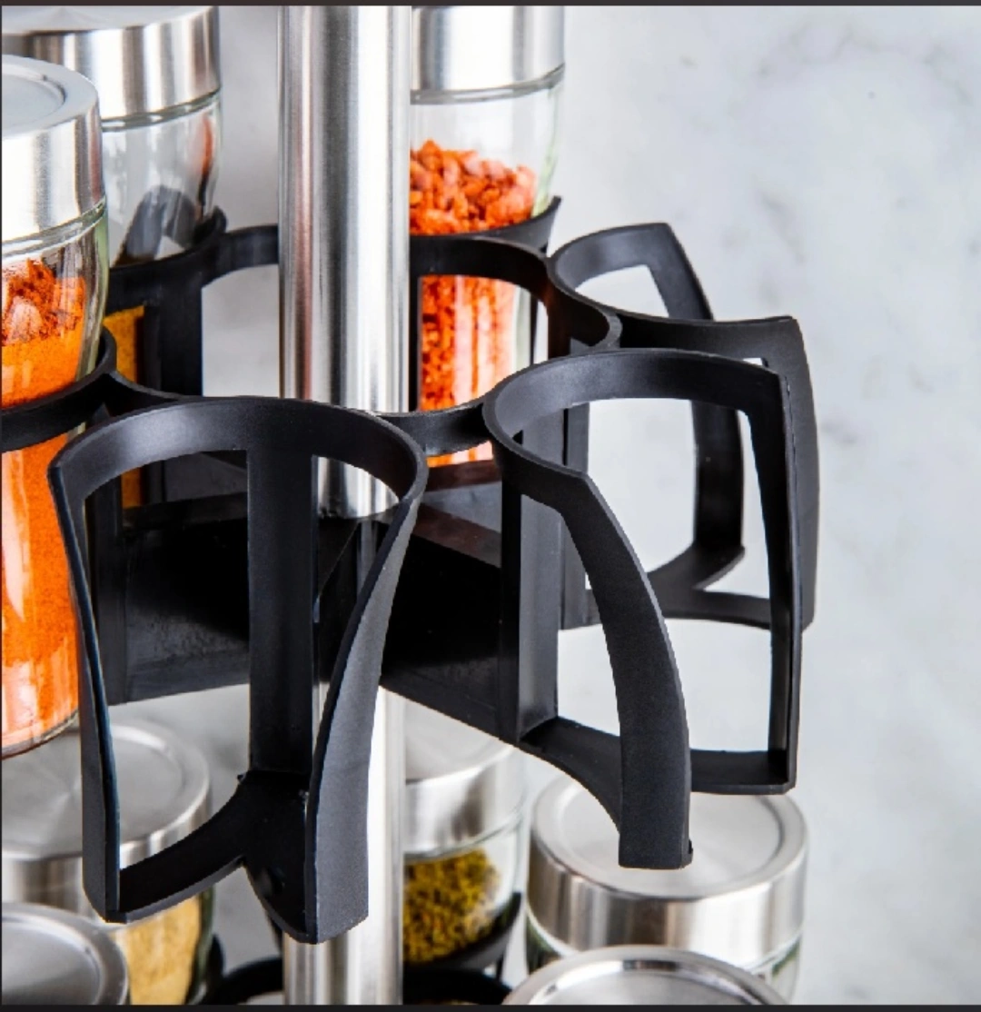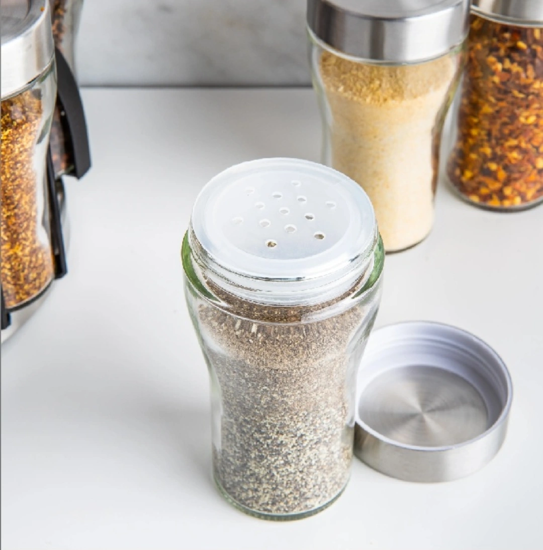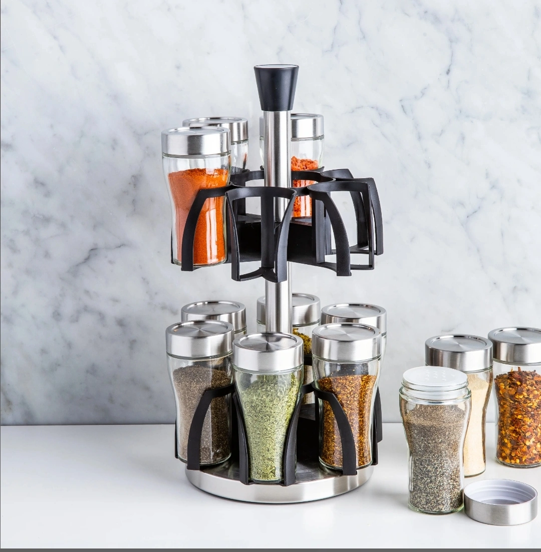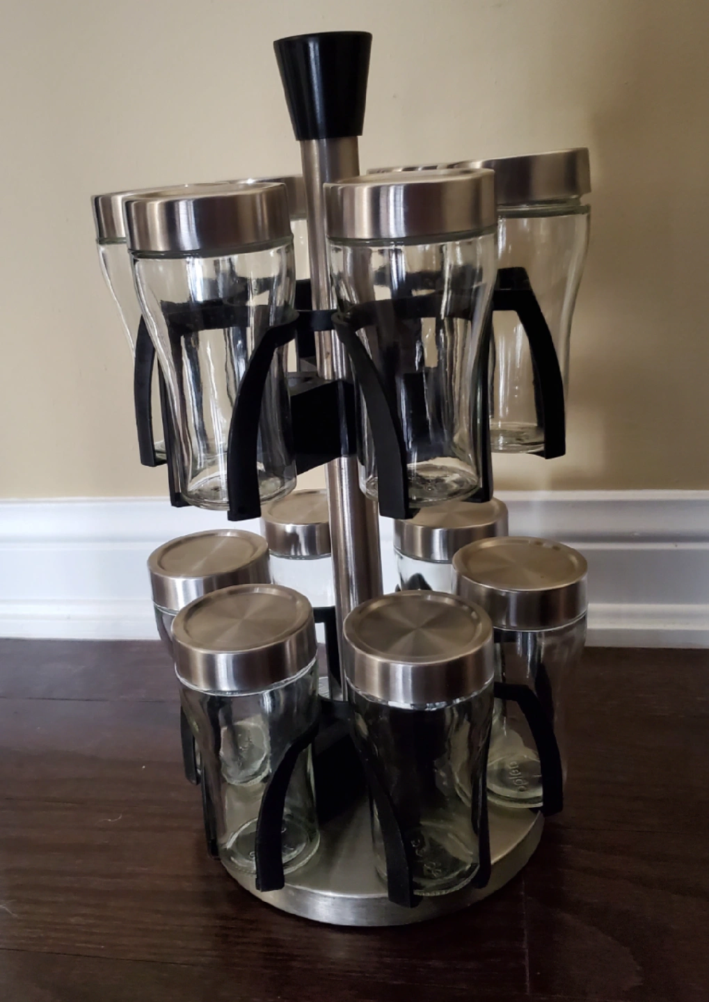 Keep your spices organized with this rotating spice rack! It comes with 12 glass jars with stainless steel lids. Great for your kitchen countertop and won't take up too much space. Used, but like new. Have cleaned and sanitized them. Ready for a new home. Features: 2-tier revolving spice rack Stainless steel and glass construction Includes 12 spice jars with a twist off lid Spice Rack: 7" dia., 13.5" tall (18 cm dia., 34 cm) Spice Jars: 2.25" dia., 4.25" tall (5.5 cm dia., 11 cm) BPA free