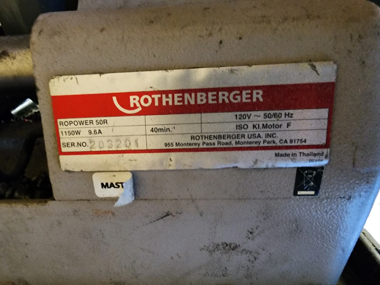 15Selling a Rothenberger Ropower 50R. It operates at 1150W and 9.6A, with a frequency of 120V ~ 50/60 Hz. The motor is an ISO KI.Motor F.