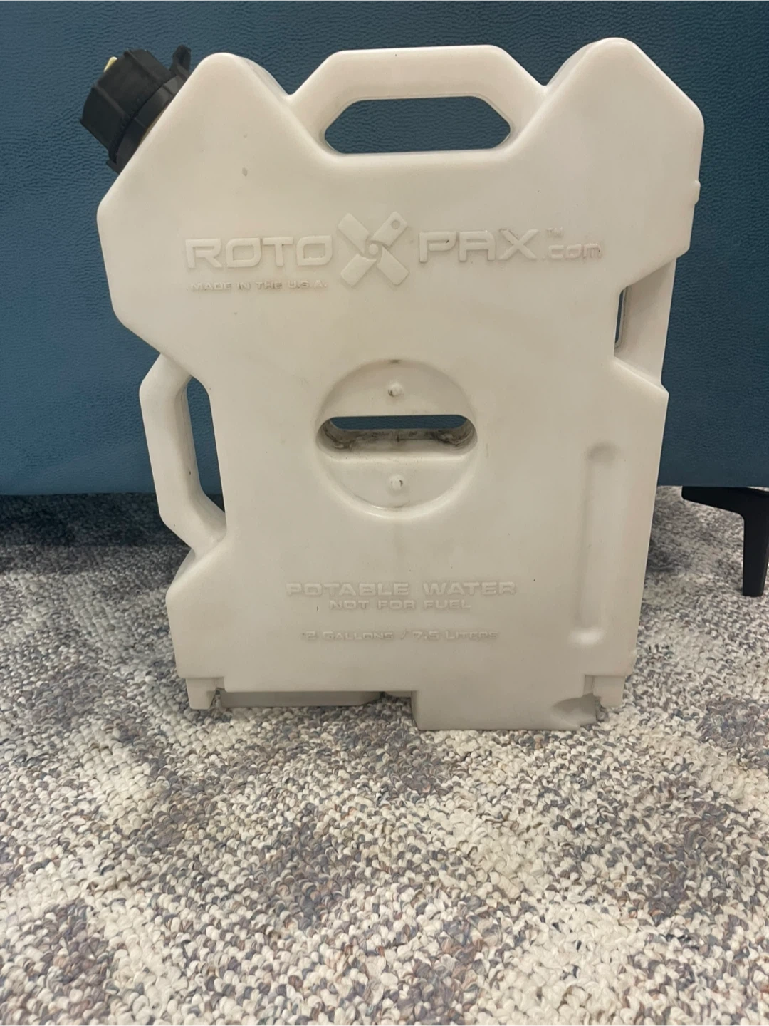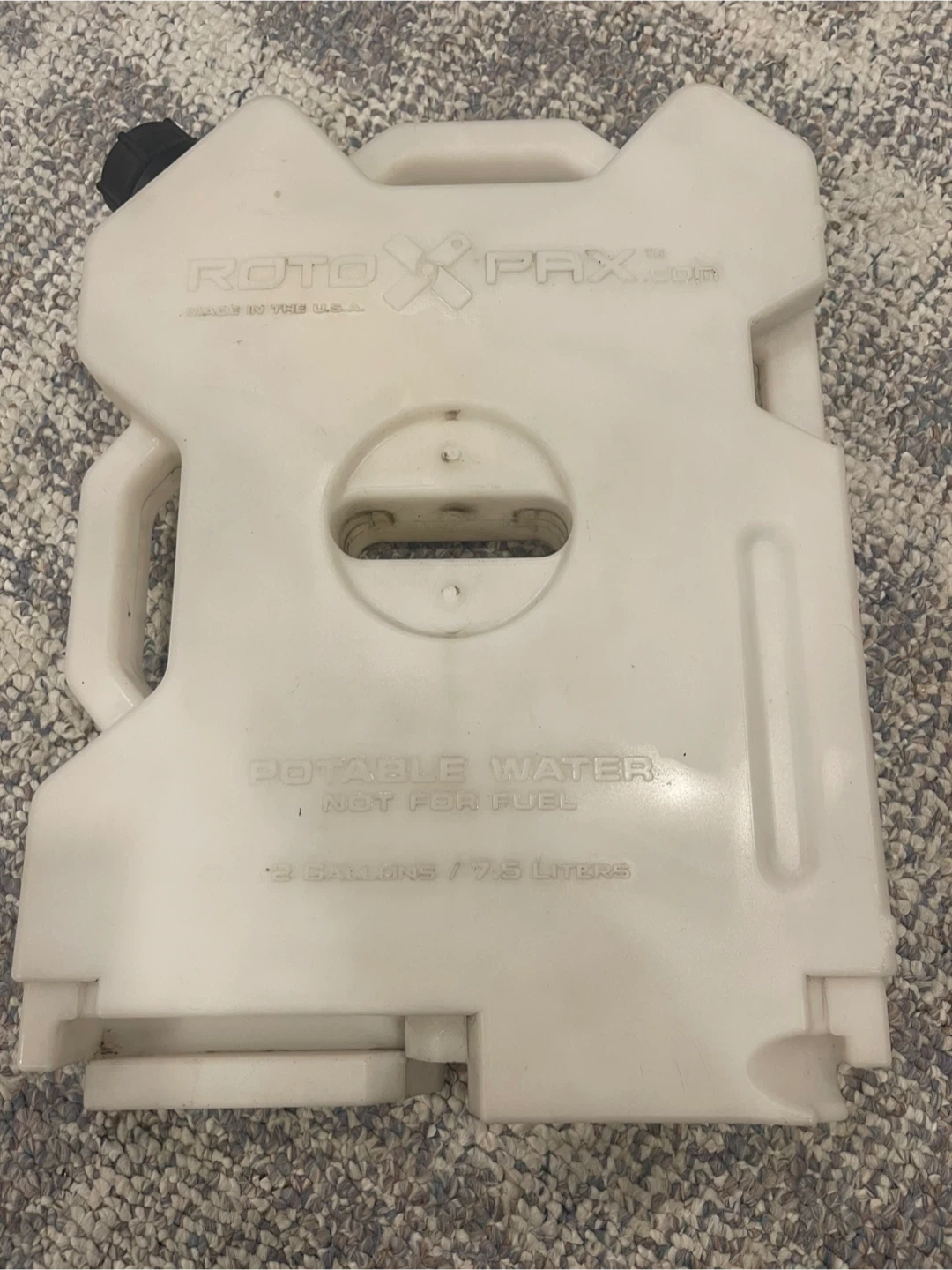 Selling a RotoPax 2-gallon water container. It's perfect for camping, hiking, or any outdoor adventure where you need a reliable water source. The container is marked 'Potable Water - Not for Fuel' and holds 2 gallons or 7.5 liters.