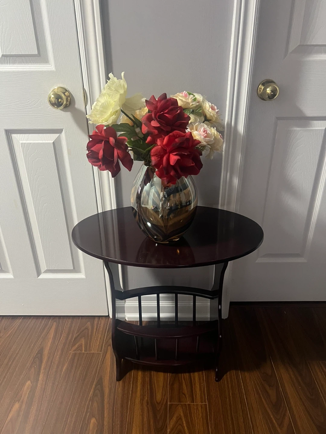 10Selling a lovely round accent table! It features a convenient magazine rack underneath, perfect for keeping your favourite reads close by. The table is a rich, dark wood colour and would make a great addition to any living room or bedroom