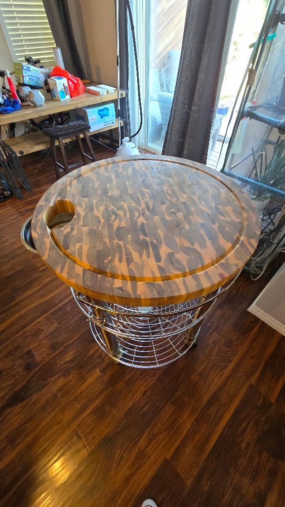 77Selling unique round butcher block table with scrap and dripping tray. It features a sturdy metal base with a bi-level convenient wire rack. The whole thing is on wheels that are in good shape, also lock in place The butcher block top has a circular design and a cutout on the side. It's a great addition to any kitchen or dining area or patio for BBQing Used once only Pickup Canals - Airdrie