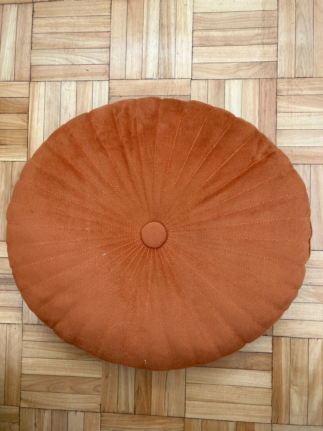212A lovely round decorative pillow in a warm burnt orange colour! It would be a great addition to any couch, chair, or bed to add a pop of colour and a bit of comfort