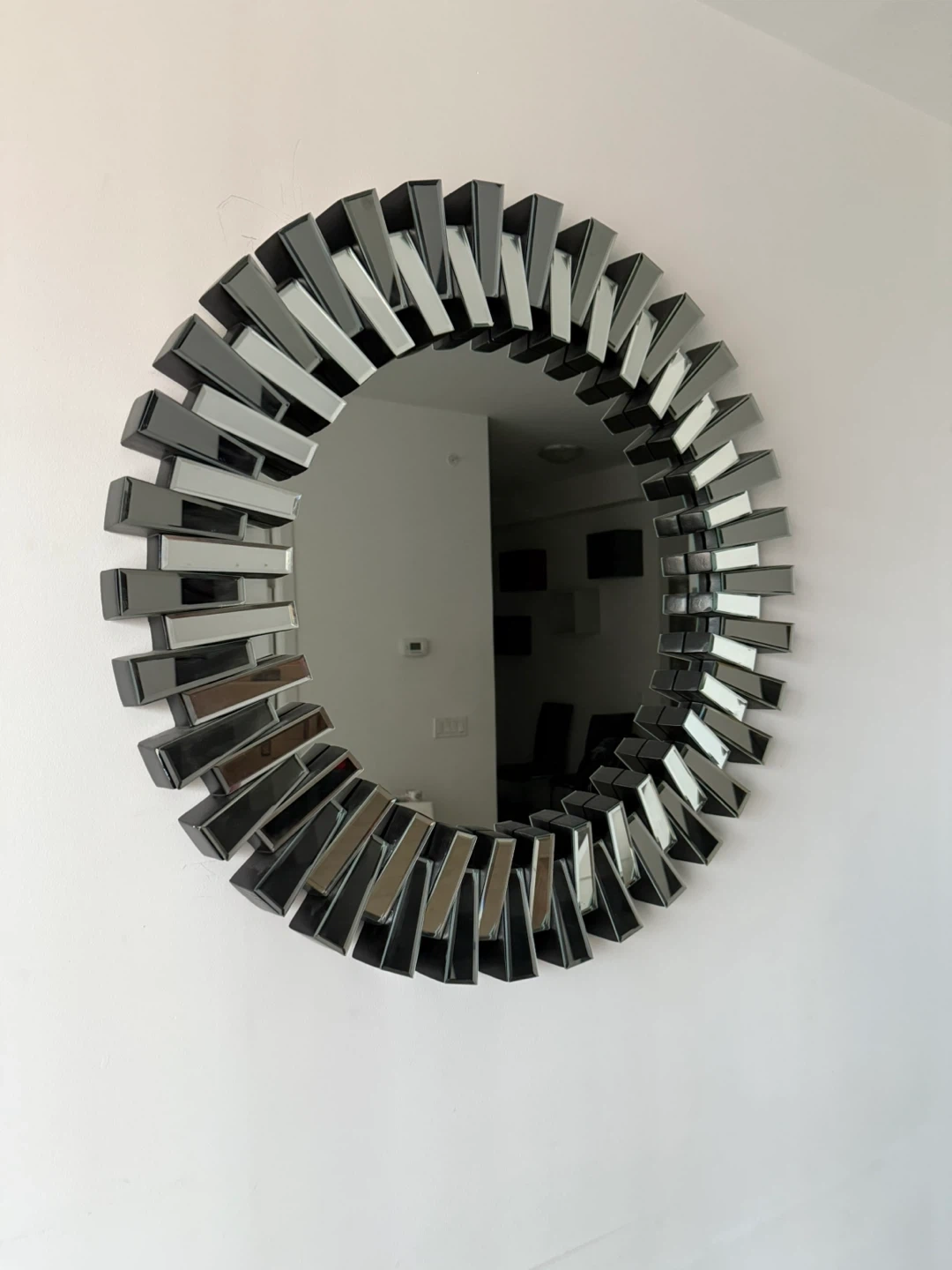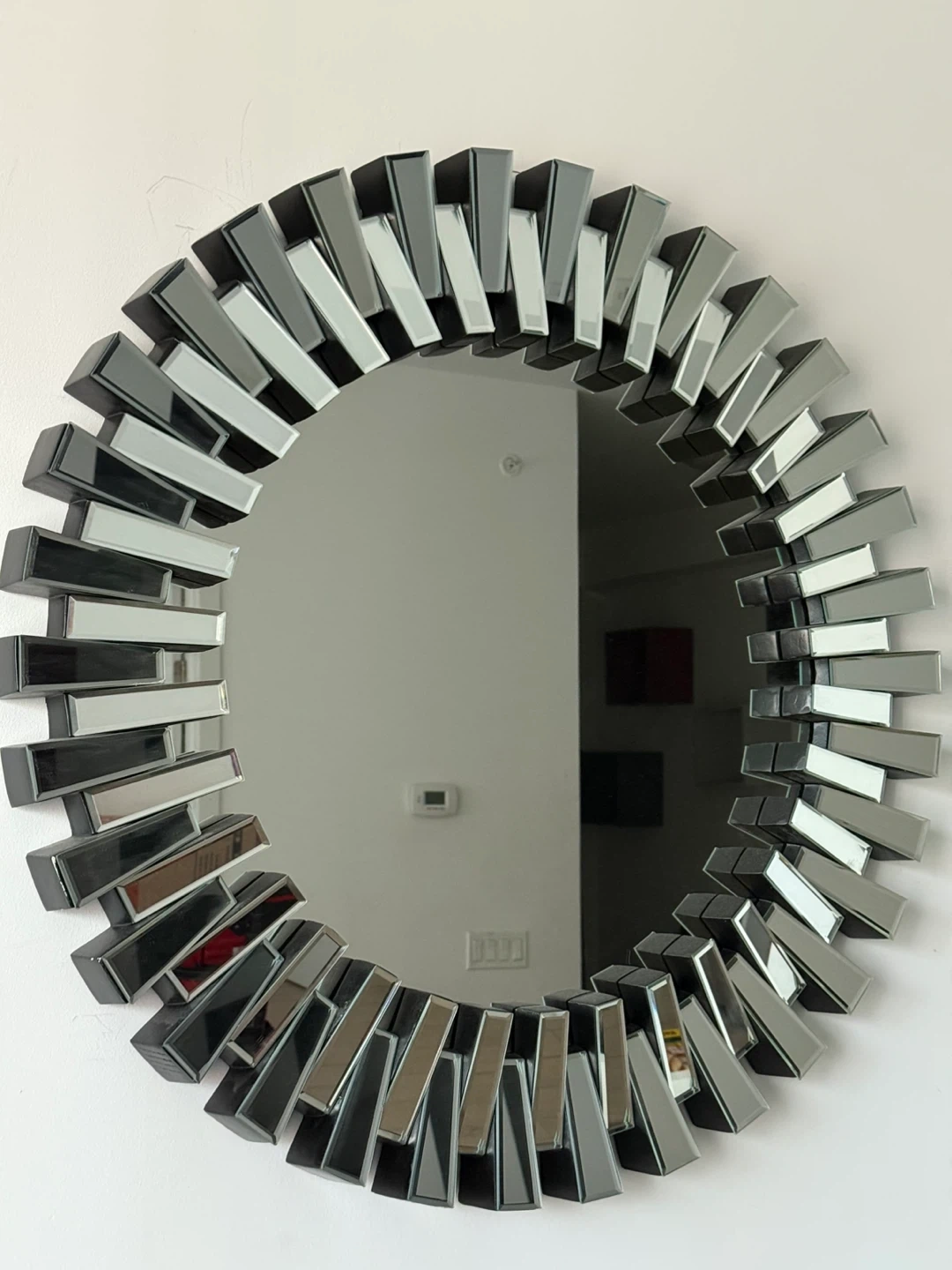 15Selling a stylish round decorative wall mirror. It's in great condition and would be a lovely addition to any room. The design features a unique pattern around the edge that catches the light beautifully. Perfect for adding a touch of elegance to your home!