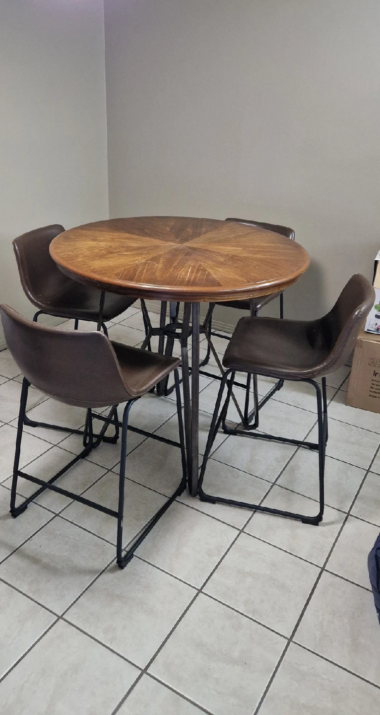 20Selling a round dining table with four chairs. The table has a wood grain pattern on top and a sturdy base. The chairs are a comfortable brown colour with black metal legs. Perfect for a small dining area.