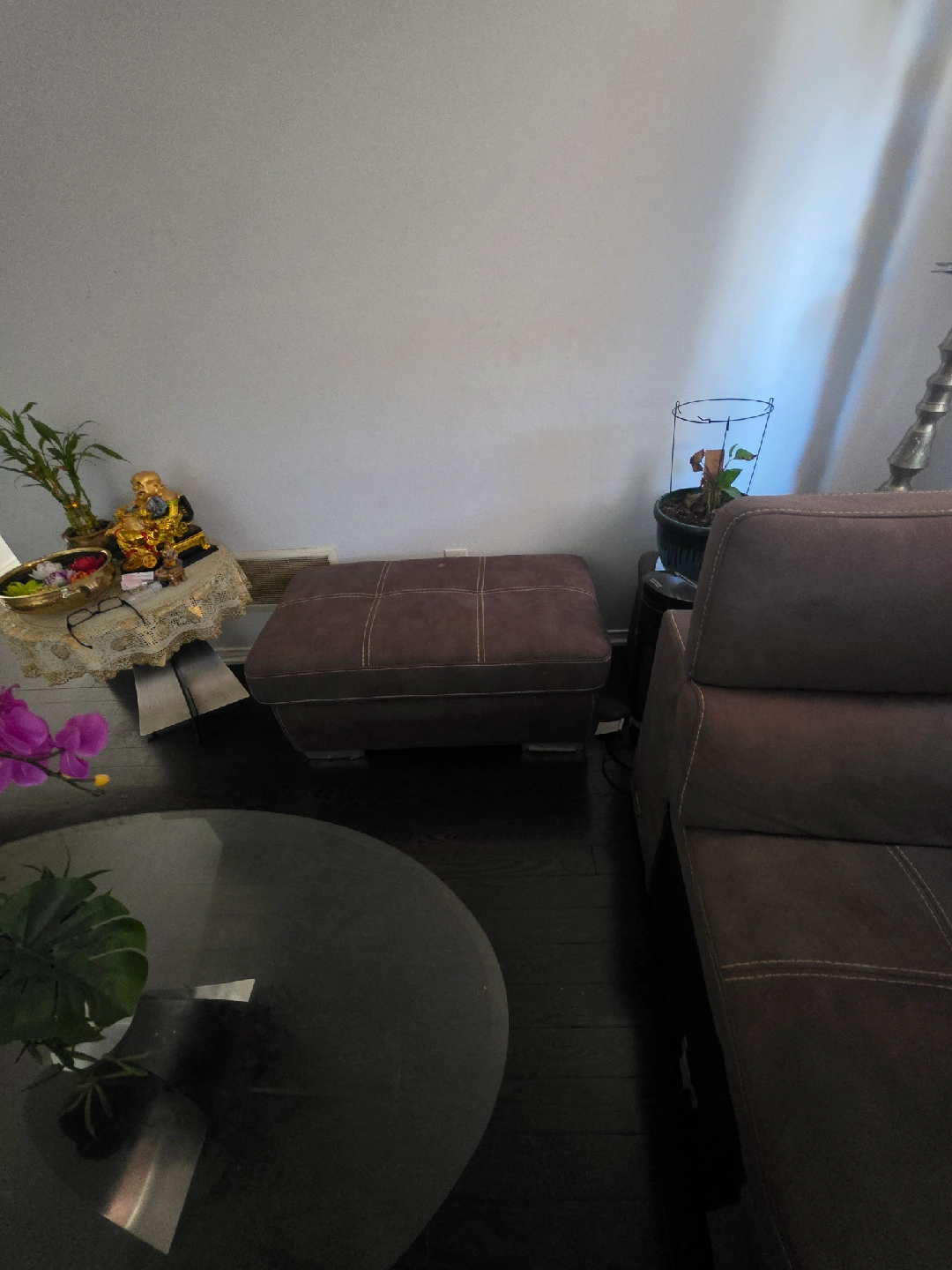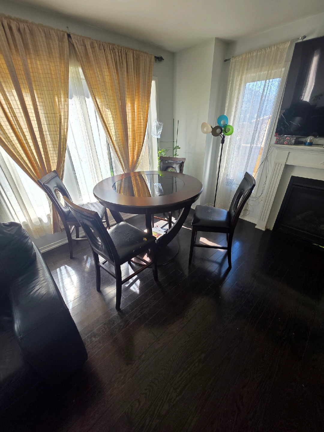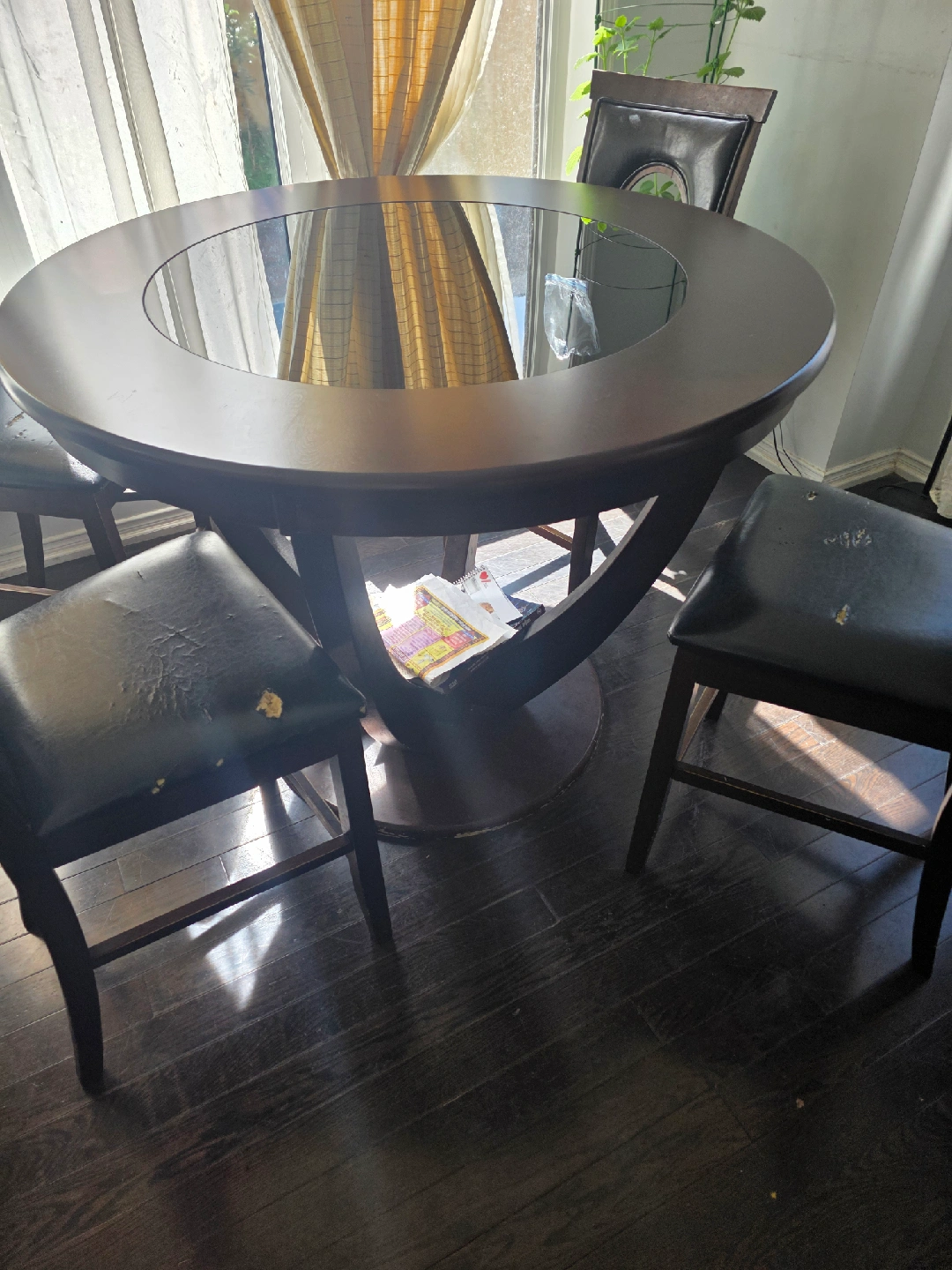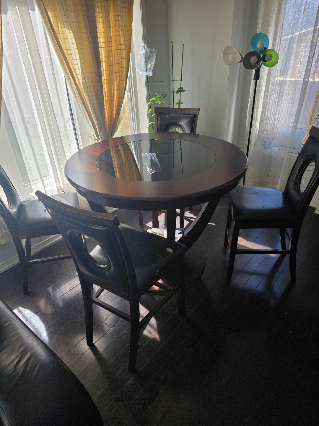 Selling a round dining table with four chairs. The table has a glass top and a dark wood finish. The chairs are also dark wood with black leather seats. There are some signs of wear on the chairs, but overall the set is in good condition.