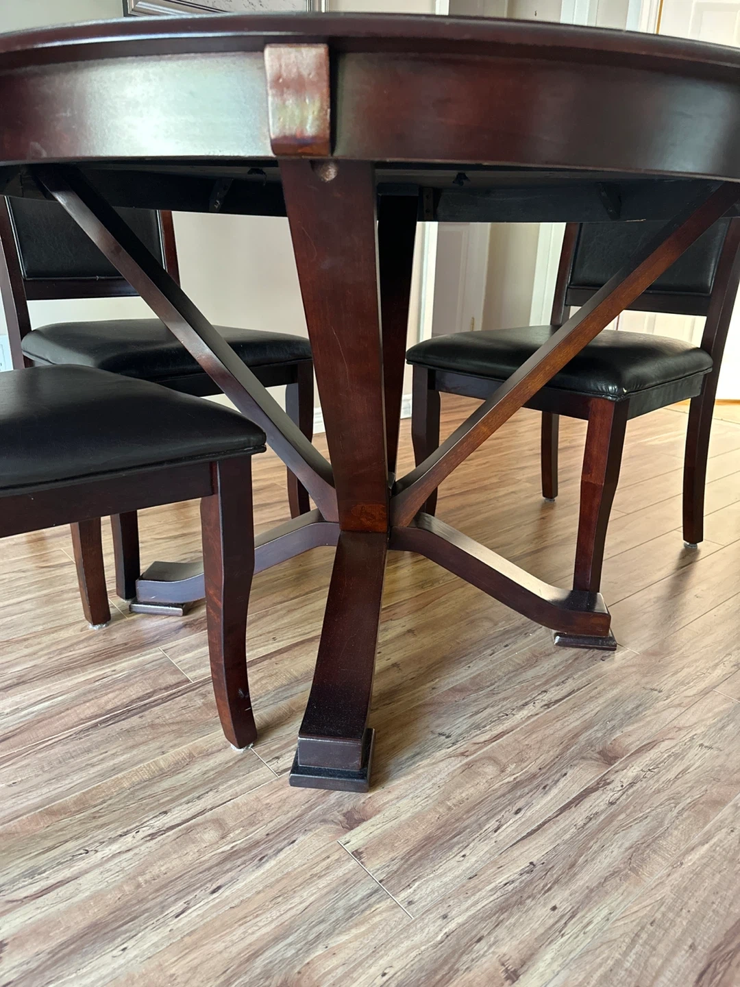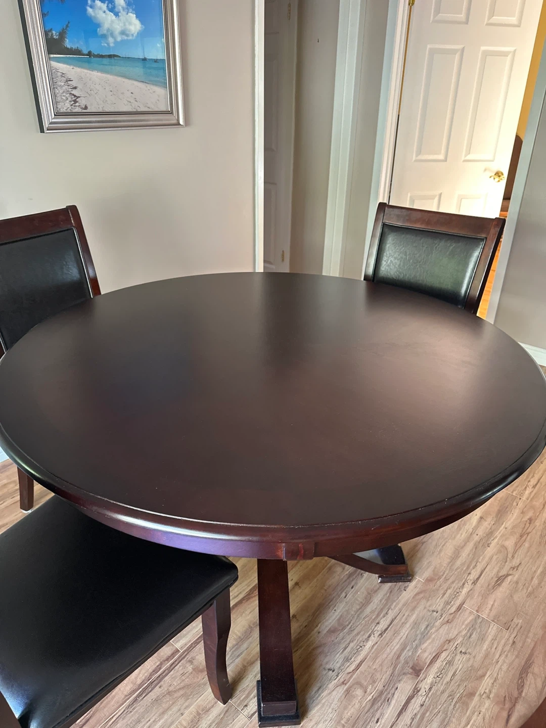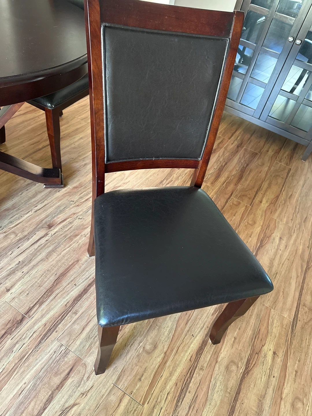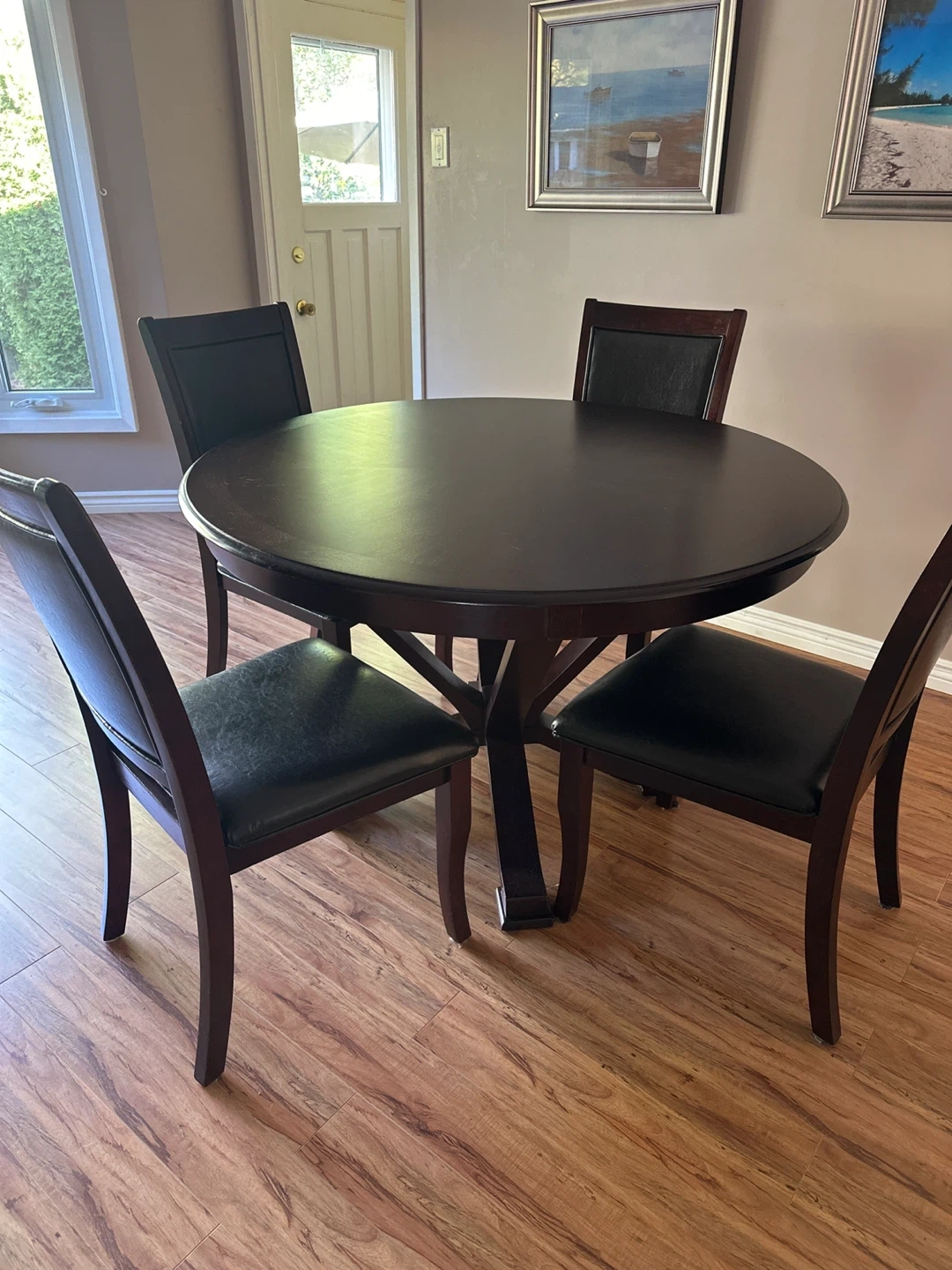 10Selling a round dining table with four chairs. The table and chairs are made of dark wood with black leather seats. Perfect for a smaller dining space!