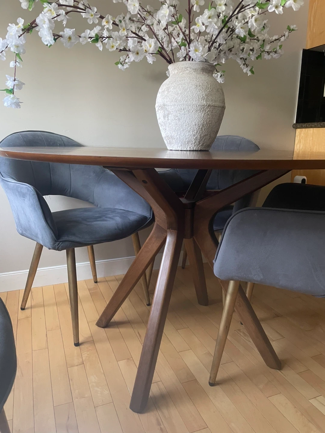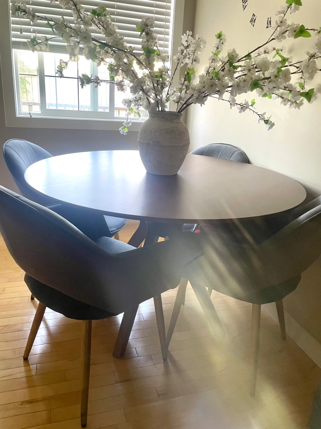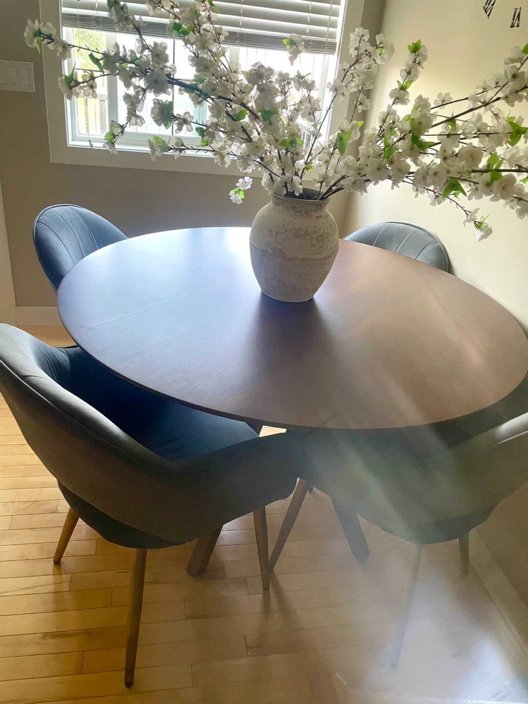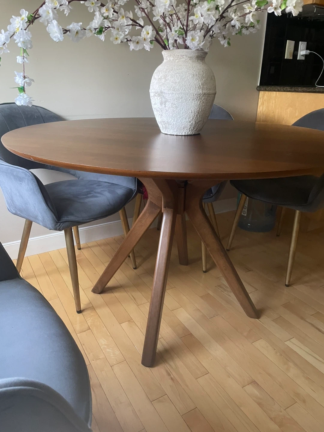 Selling a lovely round dining table with four grey chairs. The table has a beautiful wood finish and a sturdy base. The chairs are upholstered in a soft, comfortable grey fabric and have gold-tone legs. Perfect for a small dining area or kitchen nook! Dimensions: 47,5 inches diameter and 30 inches height