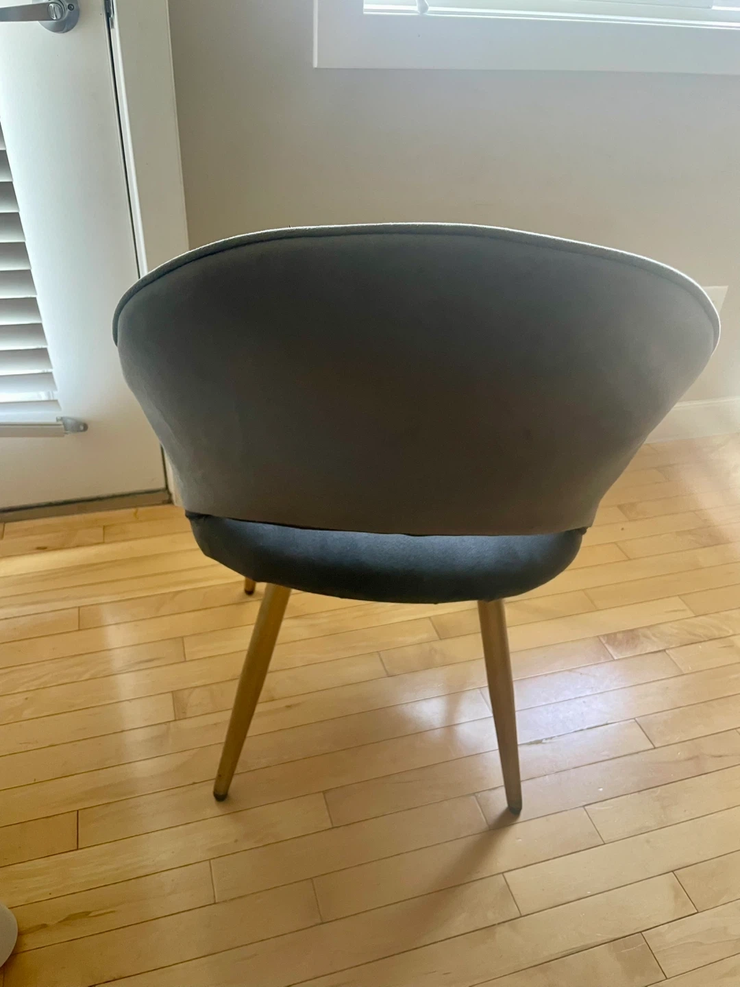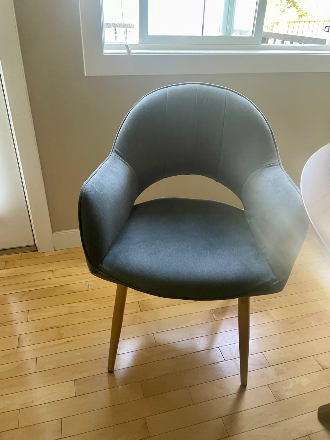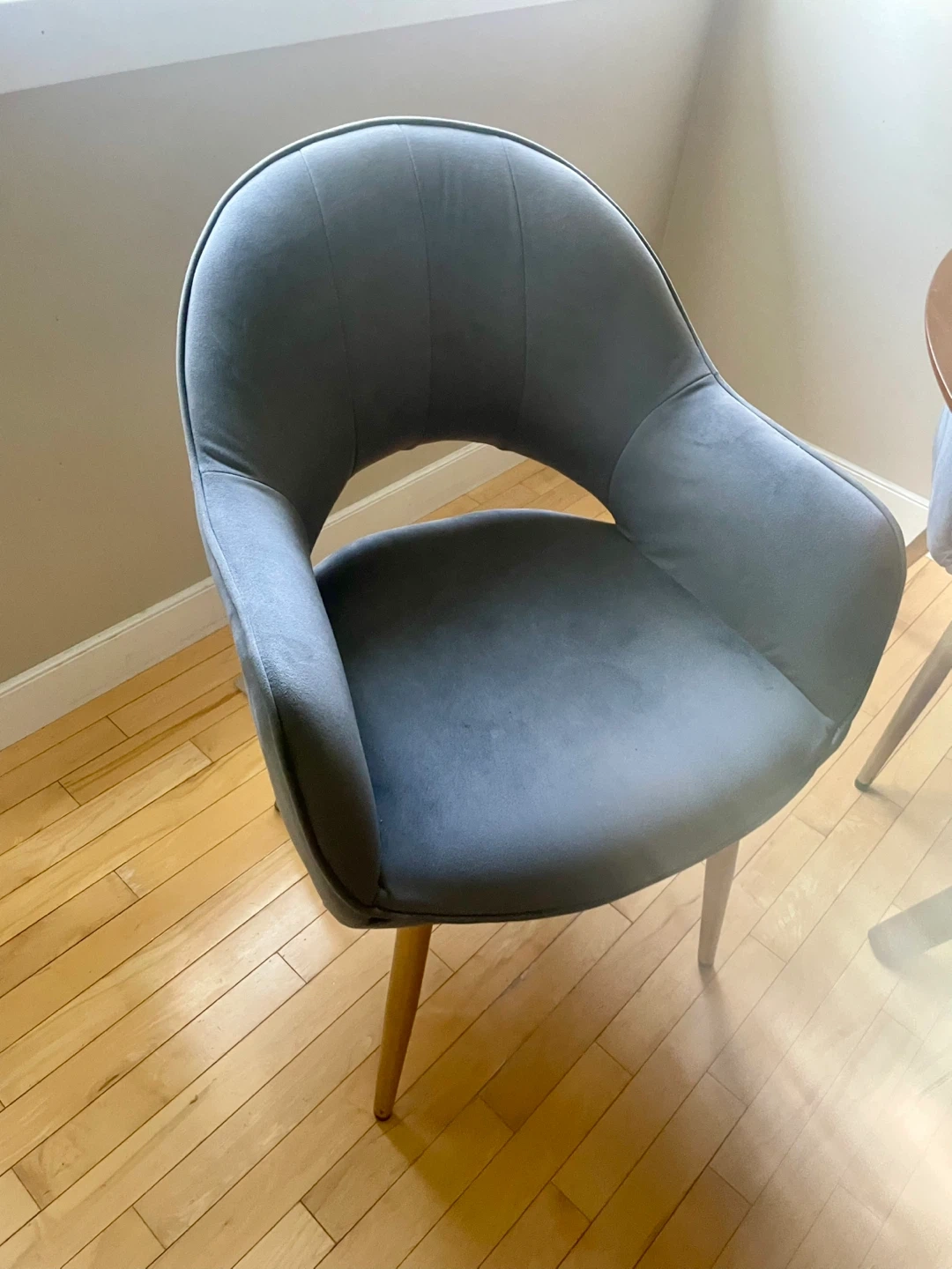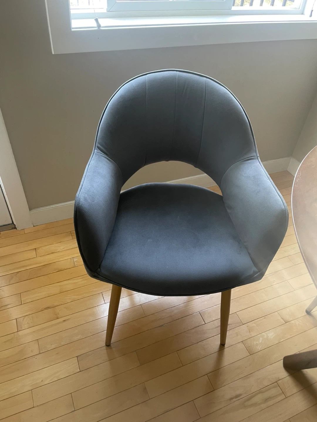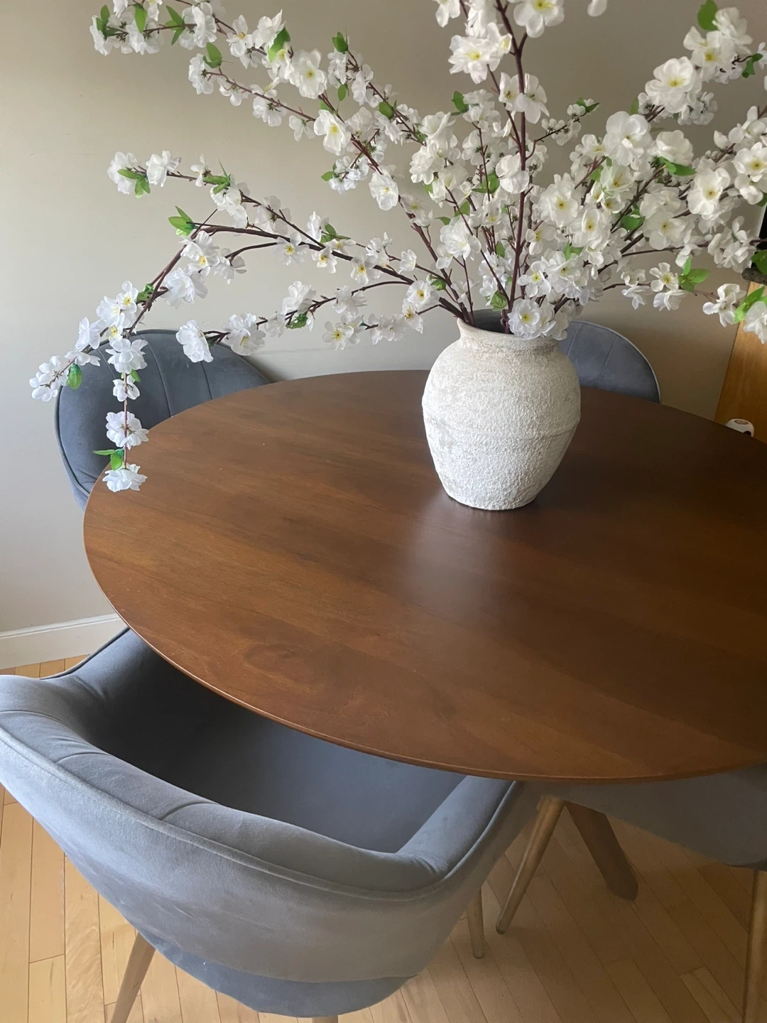 Selling a lovely round dining table with four grey chairs. The table has a beautiful wood finish and a sturdy base. The chairs are upholstered in a soft, comfortable grey fabric and have gold-tone legs. Perfect for a small dining area or kitchen nook! Dimensions: 47,5 inches diameter and 30 inches height