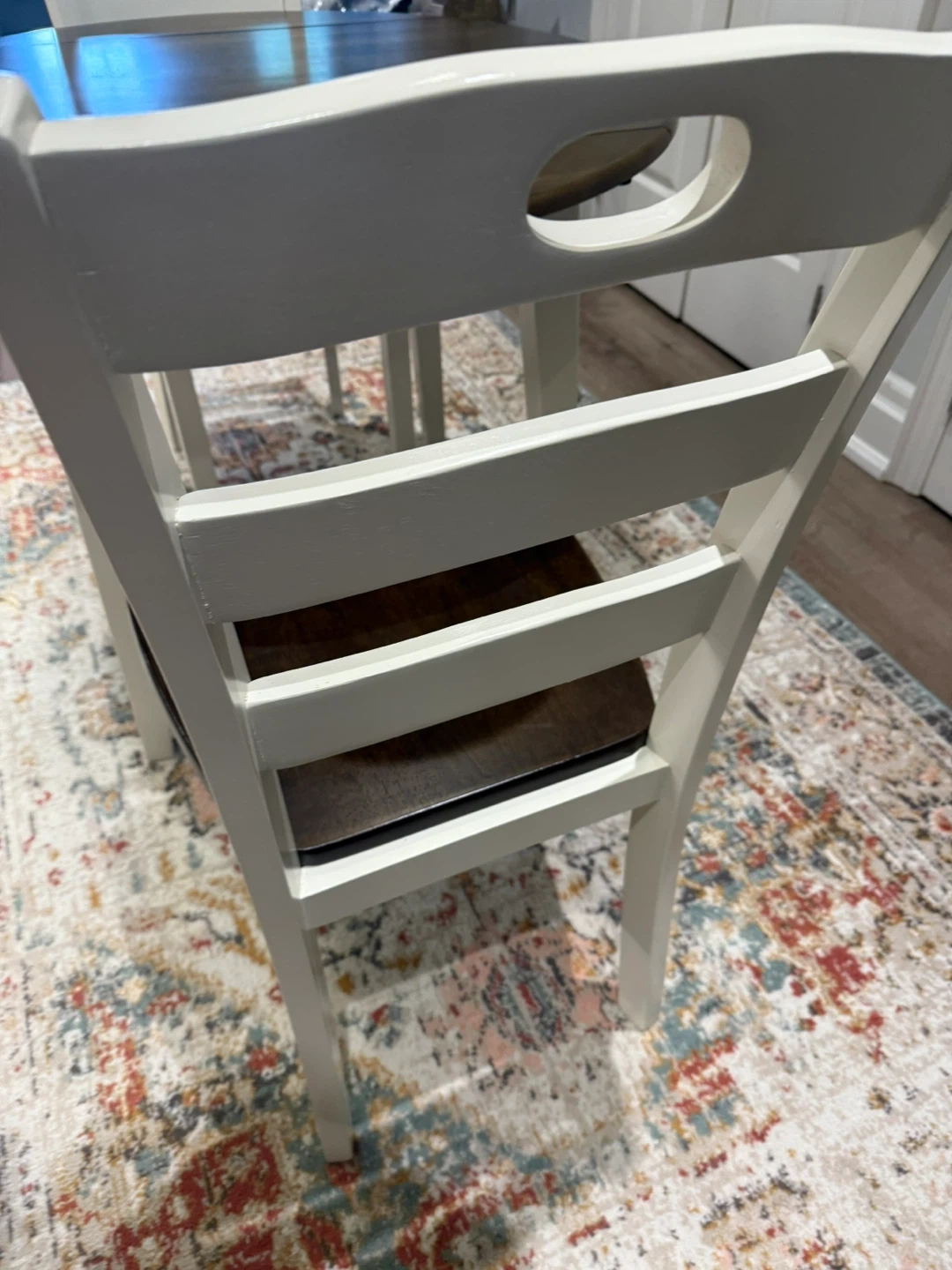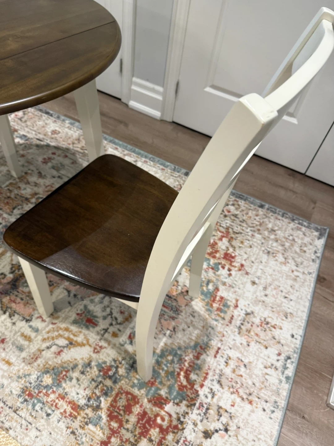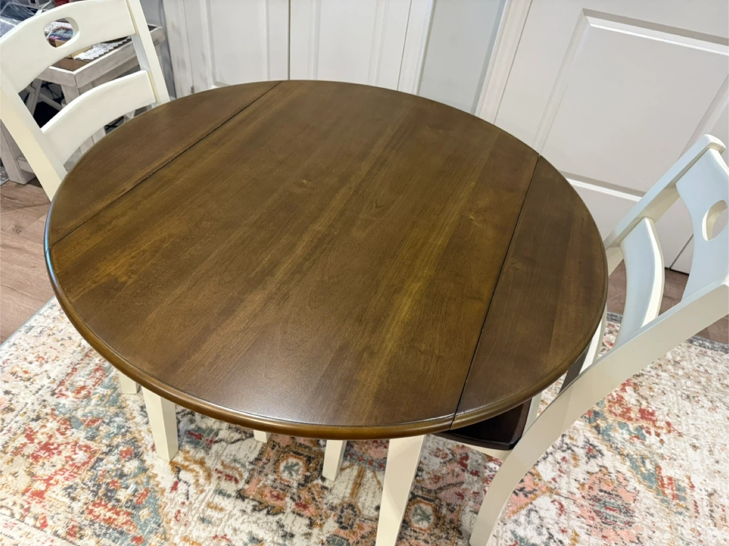 Selling a round dining table with two chairs. The table is a warm brown colour, and the chairs are a cream colour. It's a nice set for a small space, perfect for an apartment or condo. The set is in good condition and ready for a new home. Table also folds down at the sides to make it rectangular too!!
