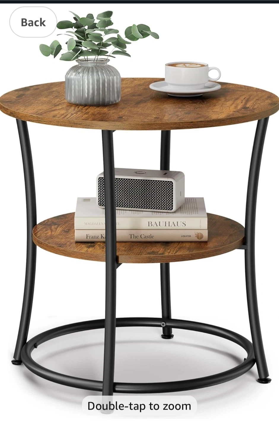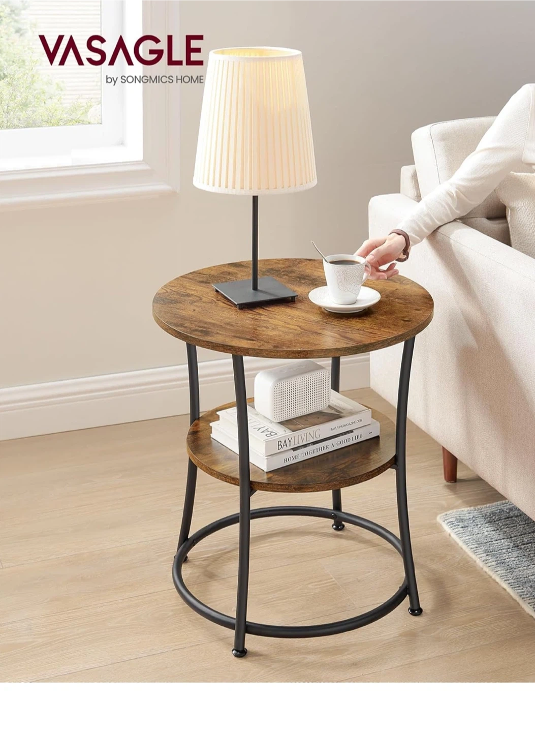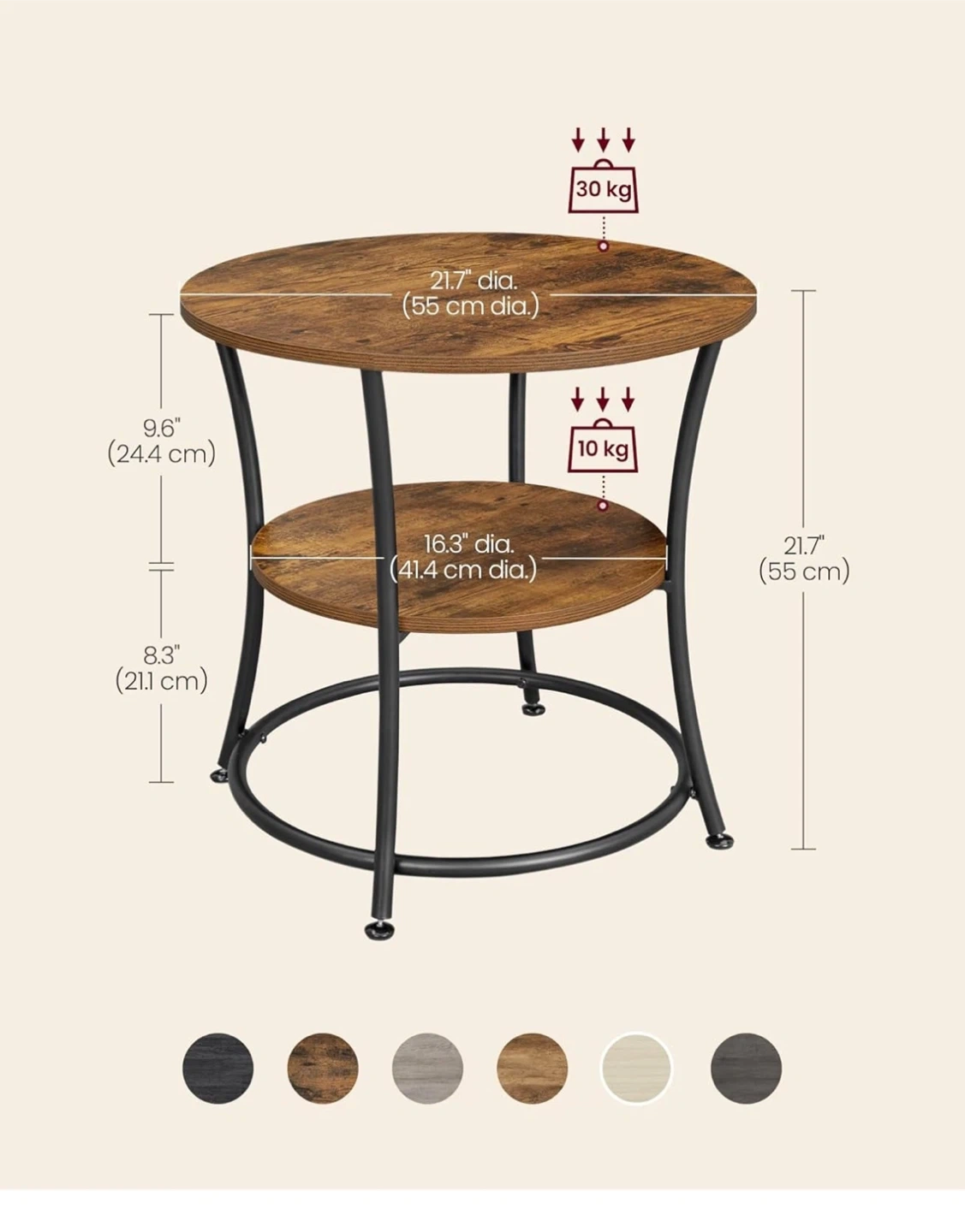 202Looking to add a touch of rustic charm to your living space? This VASAGLE round end table is perfect! It features two tiers for storage and display, with a sturdy metal frame. The table top is 21.7" in diameter (55 cm), and the lower shelf is 16.3" in diameter (41.4 cm). The overall height is 21.7" (55 cm).