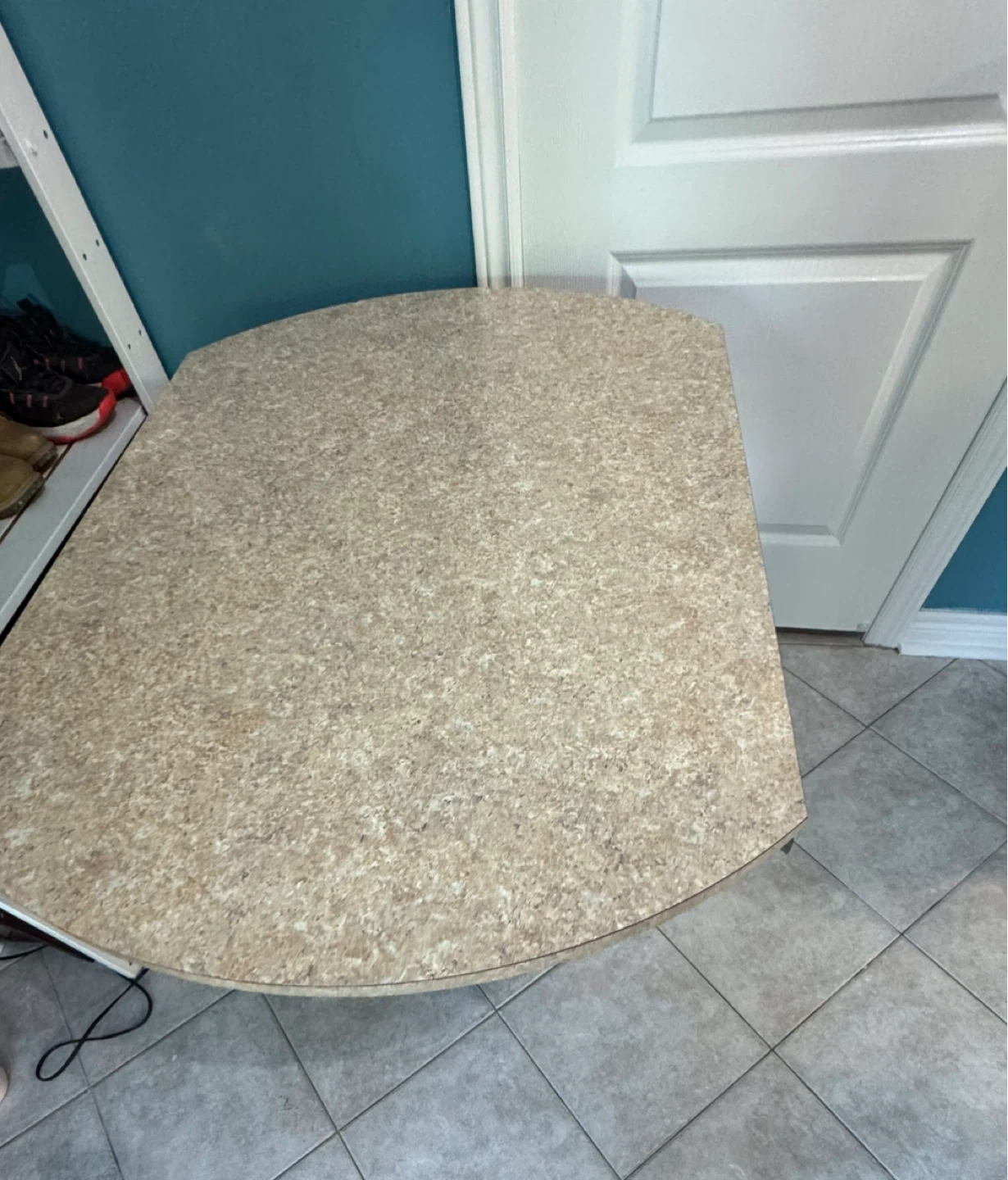 Here's a round dining table that can be extended to an oval shape! It's perfect for smaller spaces and can easily accommodate more guests when needed. The table has a neutral speckled top and a black base. It's in good condition and ready for a new home!