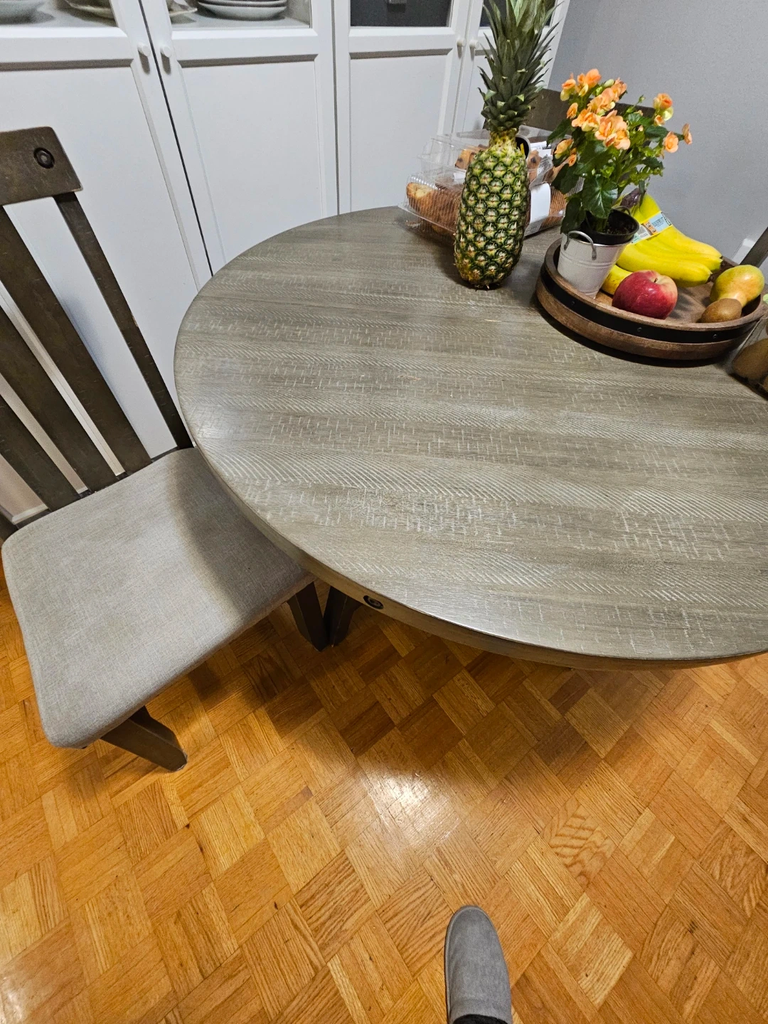 5Selling a round dining table that extends with four matching chairs. The table has a light grey wood grain finish, and the chairs have a grey upholstered seat with a nailhead trim. The set is in good condition and would be a great addition to any dining space