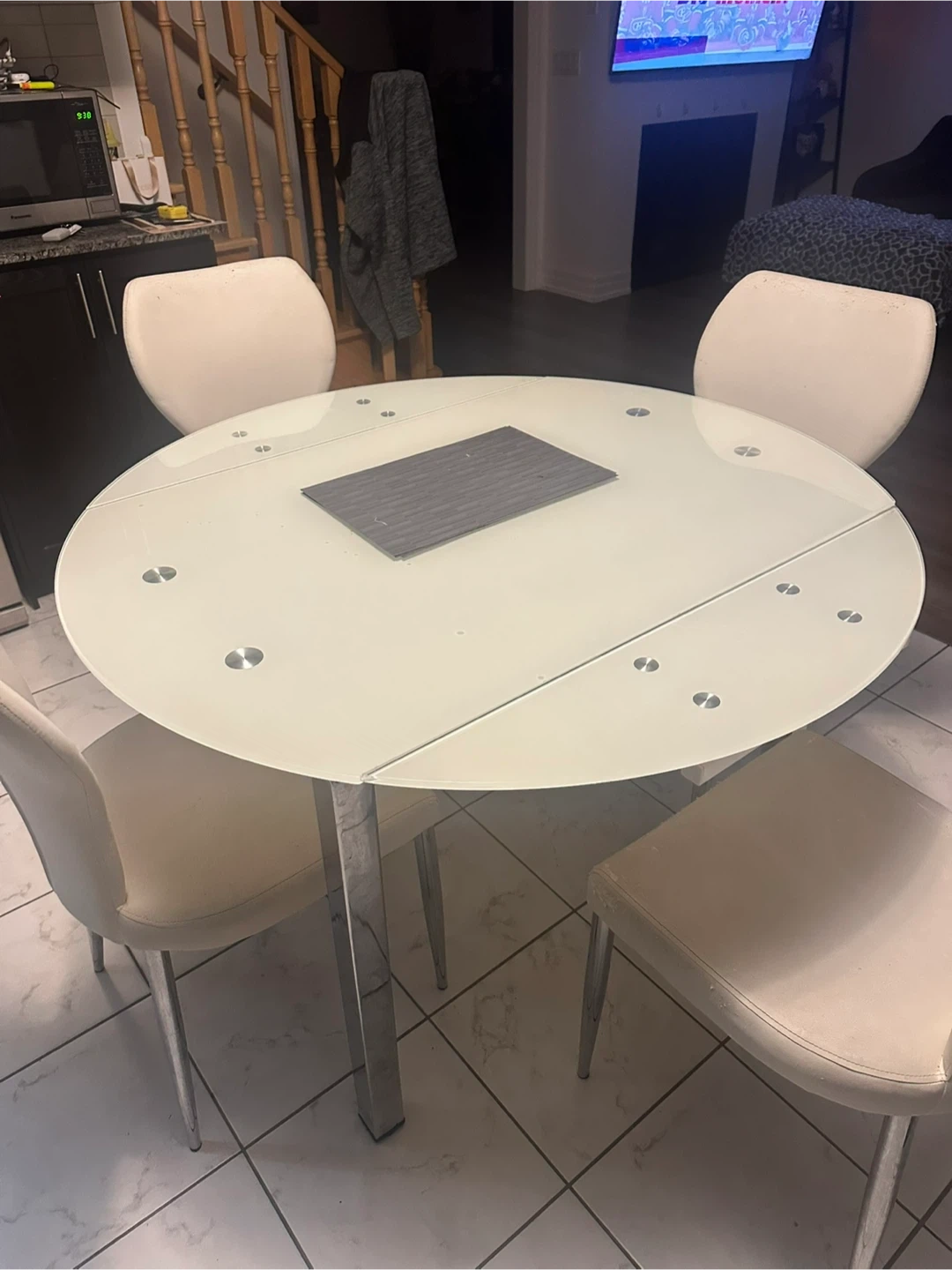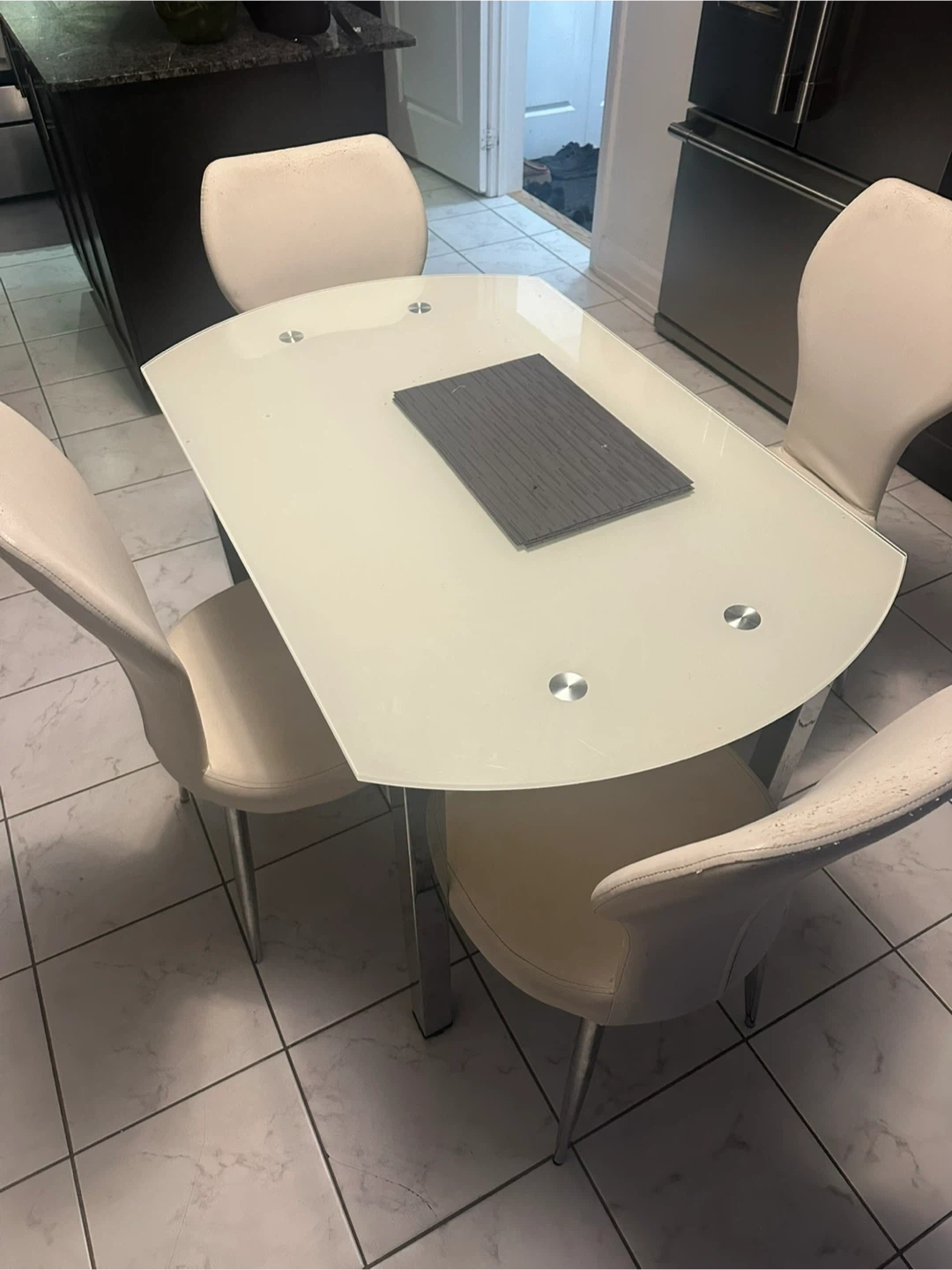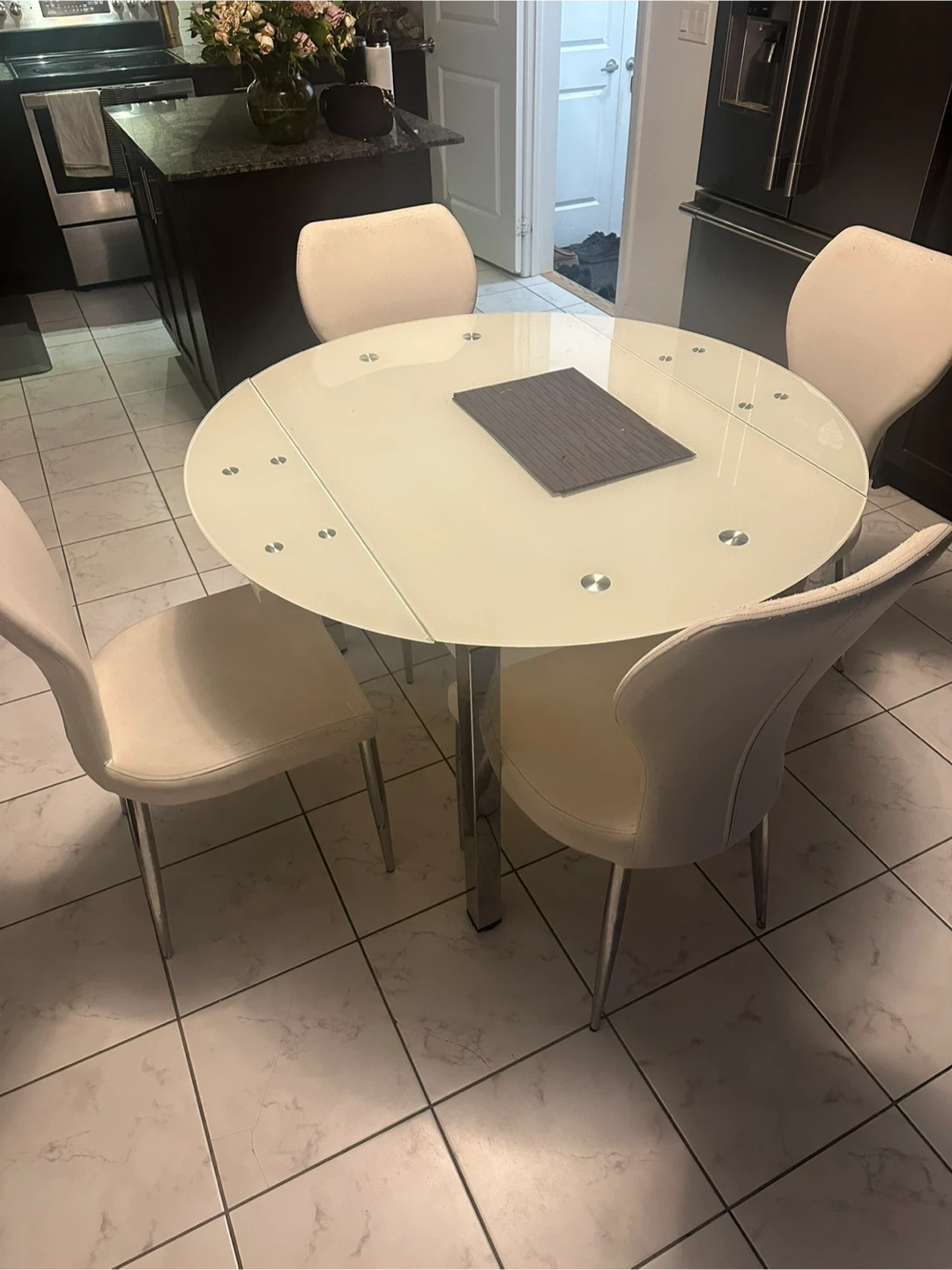 Selling a round glass dining table that comes with four chairs. The table has a modern look with a glass top and chrome legs. The chairs are upholstered in a cream-coloured material and have a sleek design. It's a great set for a smaller dining area or kitchen!