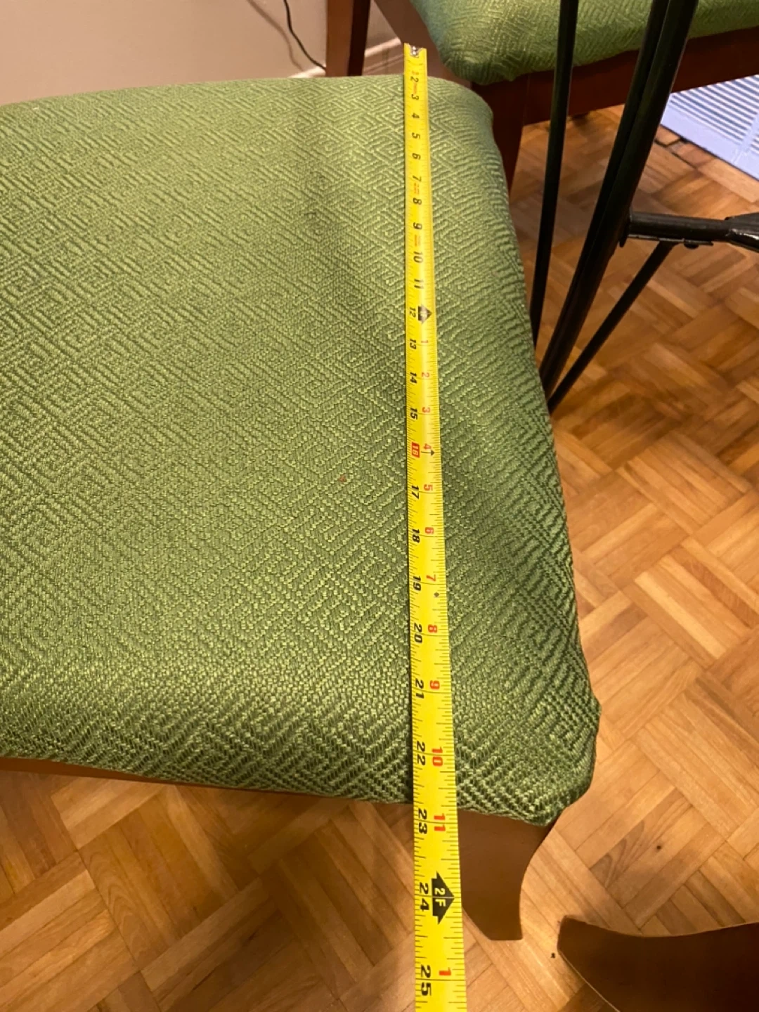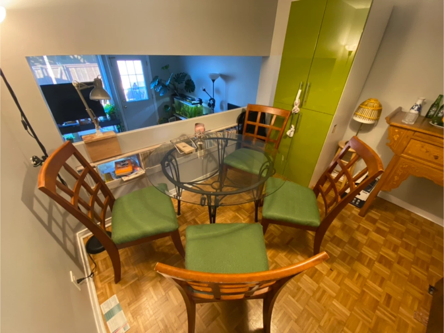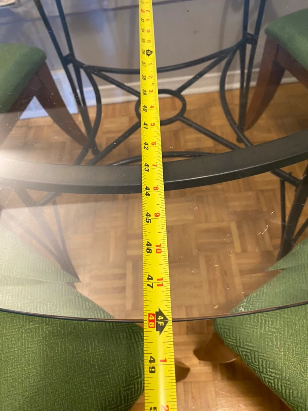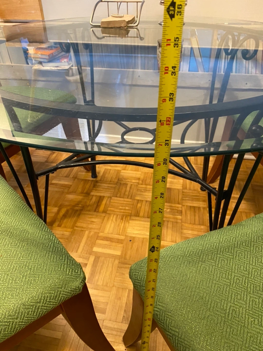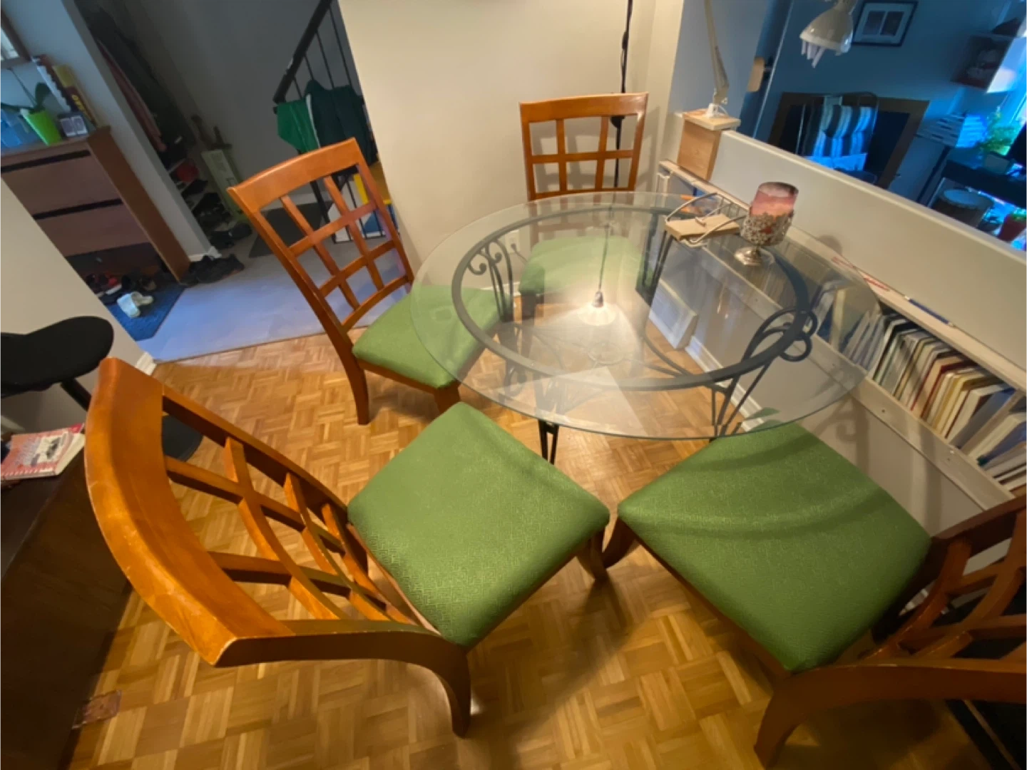 Selling a dining table set with a round glass top and four chairs. The table is approximately 48 inches in diameter. The chairs have a green, woven fabric seat and a wooden frame