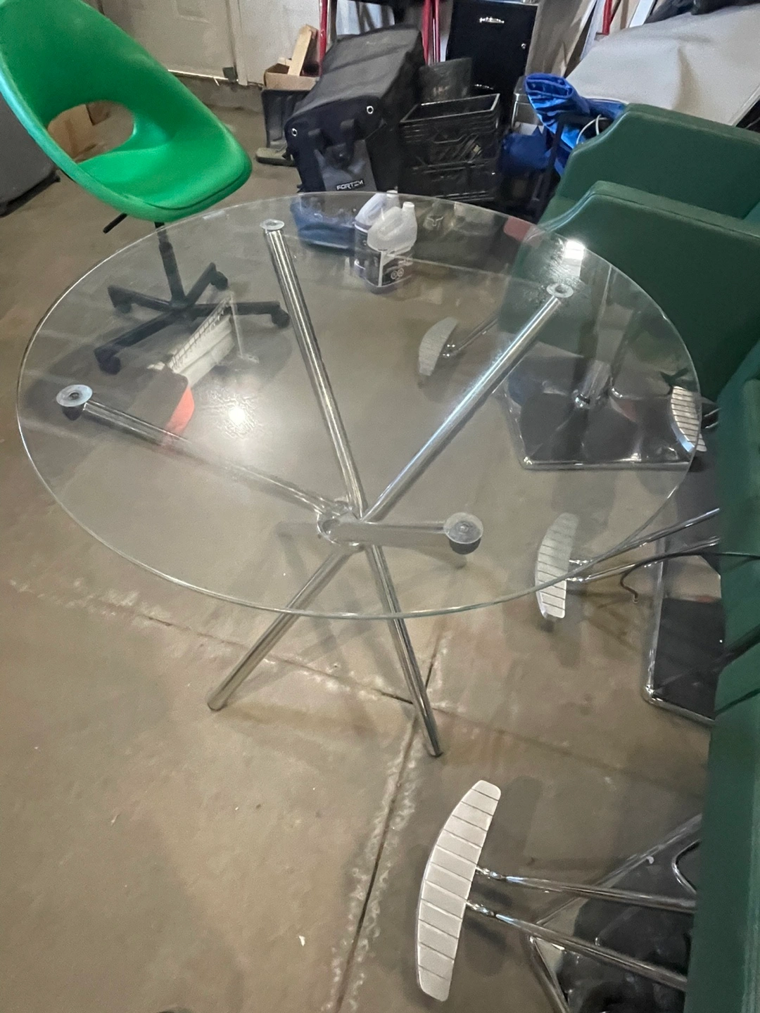65A round table. Features a clear glass top. The base is made of metal. Perfect for a small coffee table or an outdoor patio table; you could use this to make a nice spot to sit and read a book.