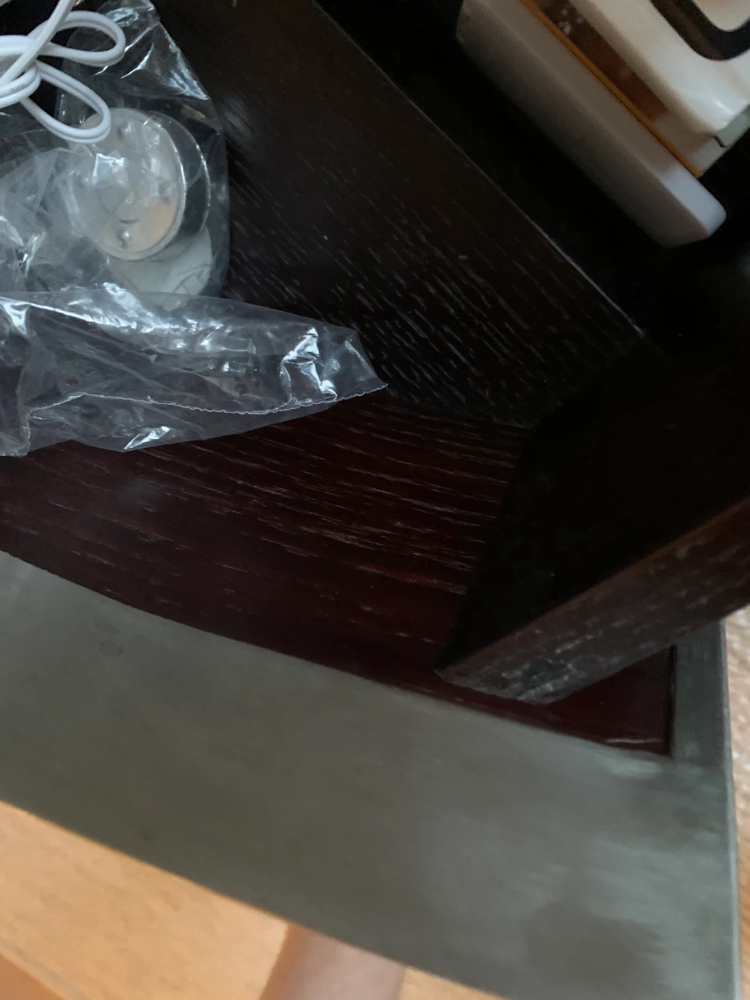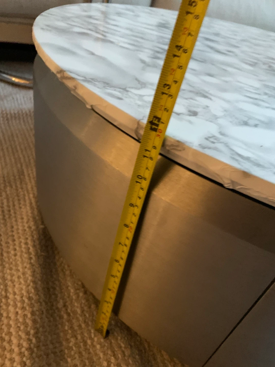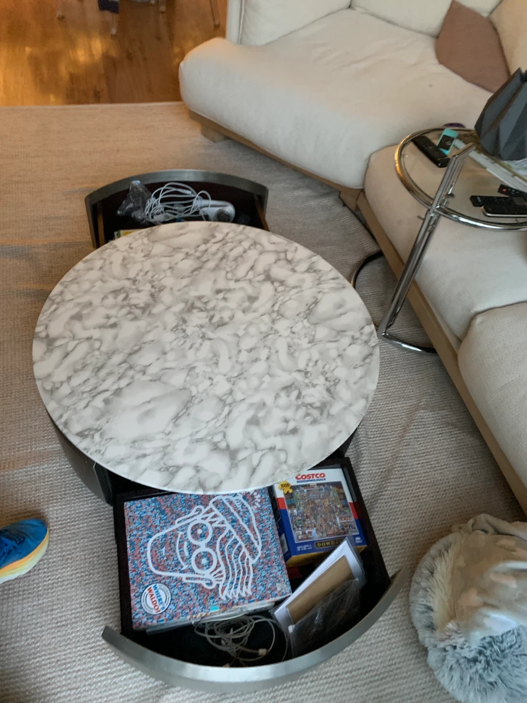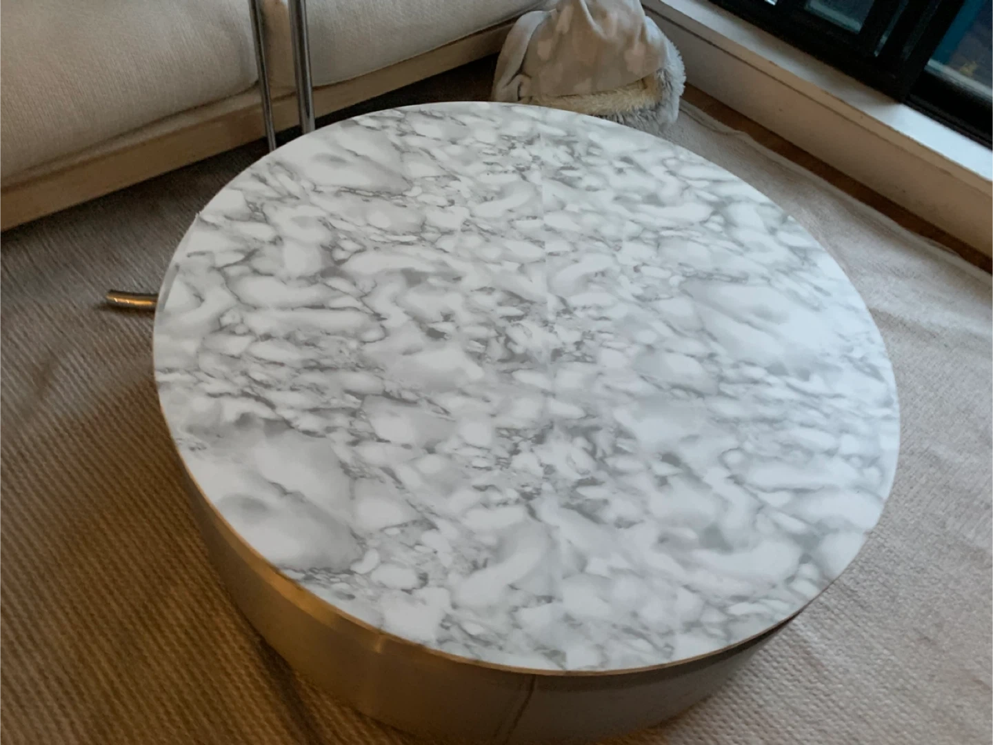 10This solid wood (oak) cherry stain round coffee table with a marble inspired top and built-in storage drawer. Wrapped in a thick brush, steel adding a modern but elegant design to any room. It's a stylish piece that adds a touch of elegance to any living room while providing practical storage space. The table is in great condition and ready for a new home!