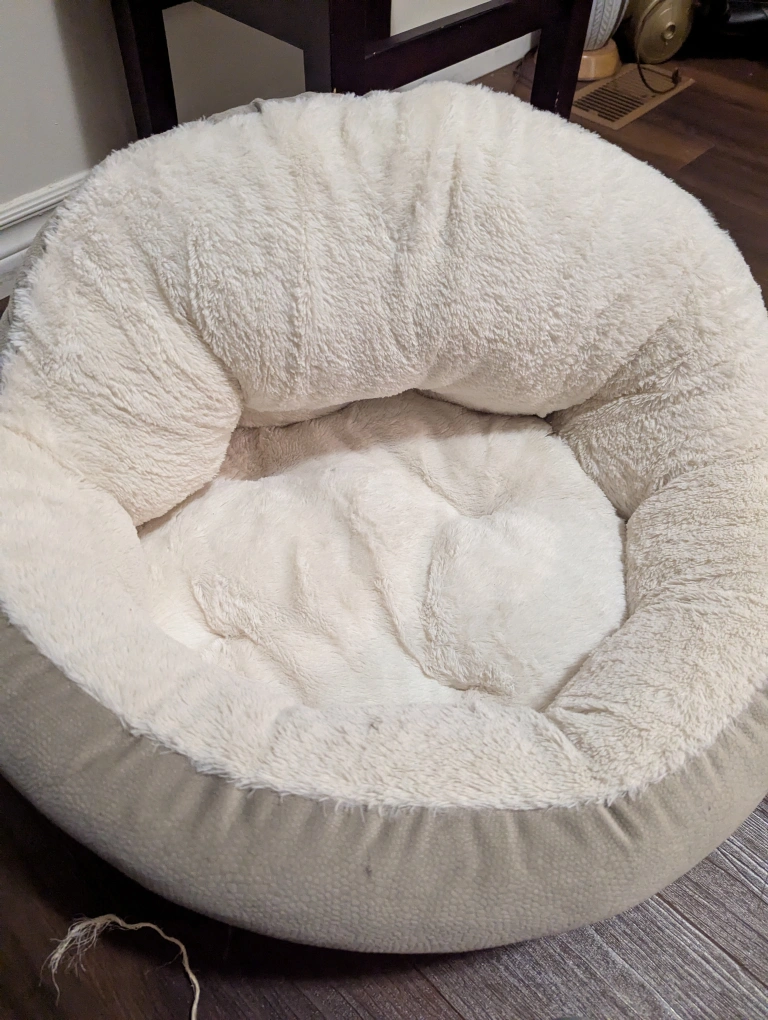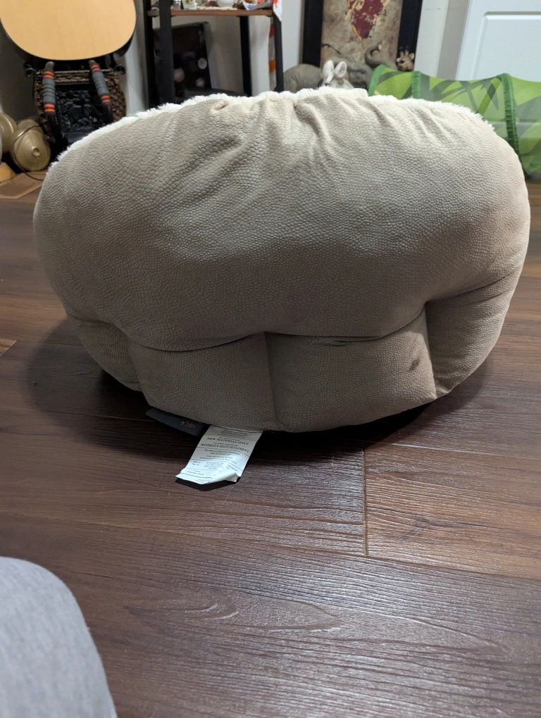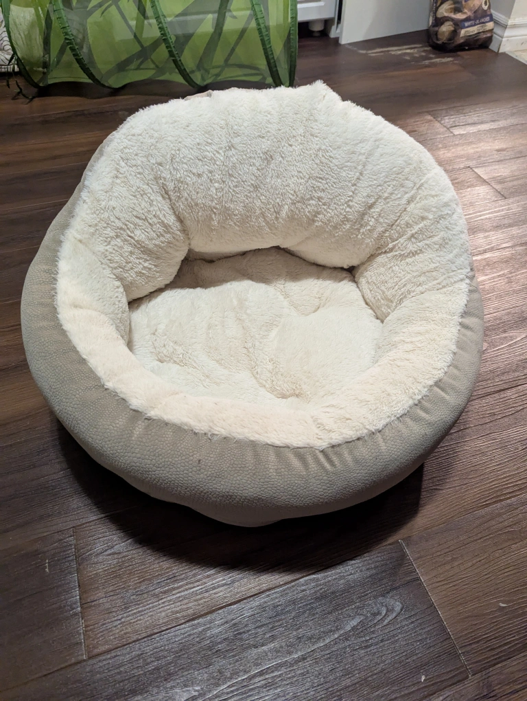 52Selling a comfy round pet bed! It's in great shape and super cozy for your furry friend. Perfect for cats or small dogs looking for a snug place to nap. It's a neutral colour that should fit in with most home decors