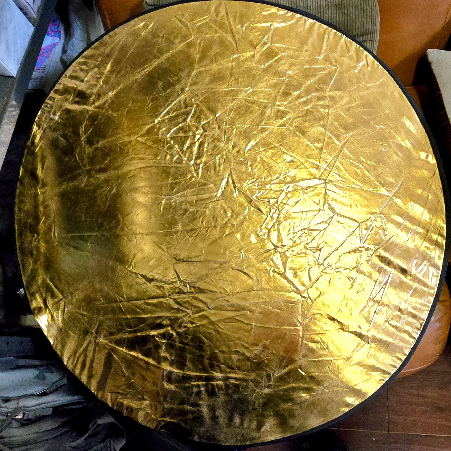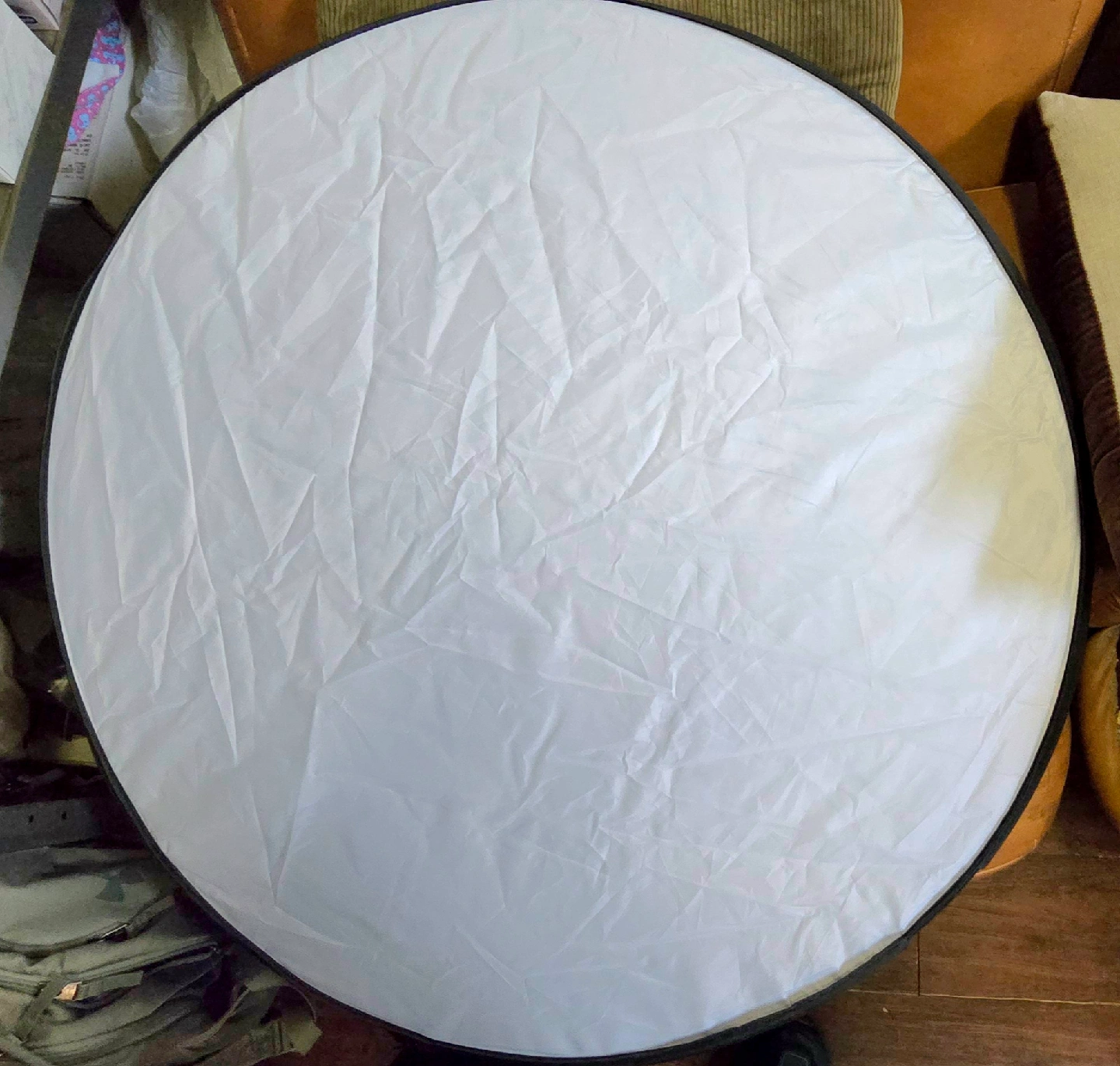 158This is a round photography reflector with a white and gold surface. It's in great shape and ready to help you get the perfect lighting for your photos