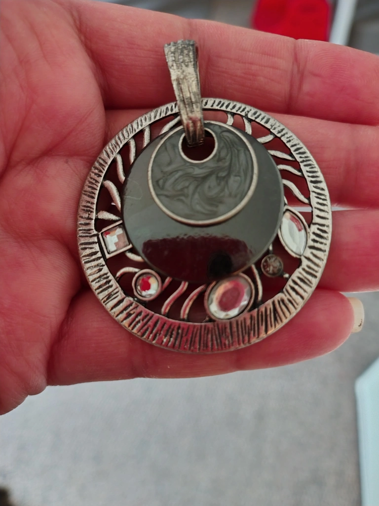 27Selling a round pendant necklace with a silver tone finish. It features a circular design with a black enamel centre and clear stone accents. A stylish accessory to add to your collection!