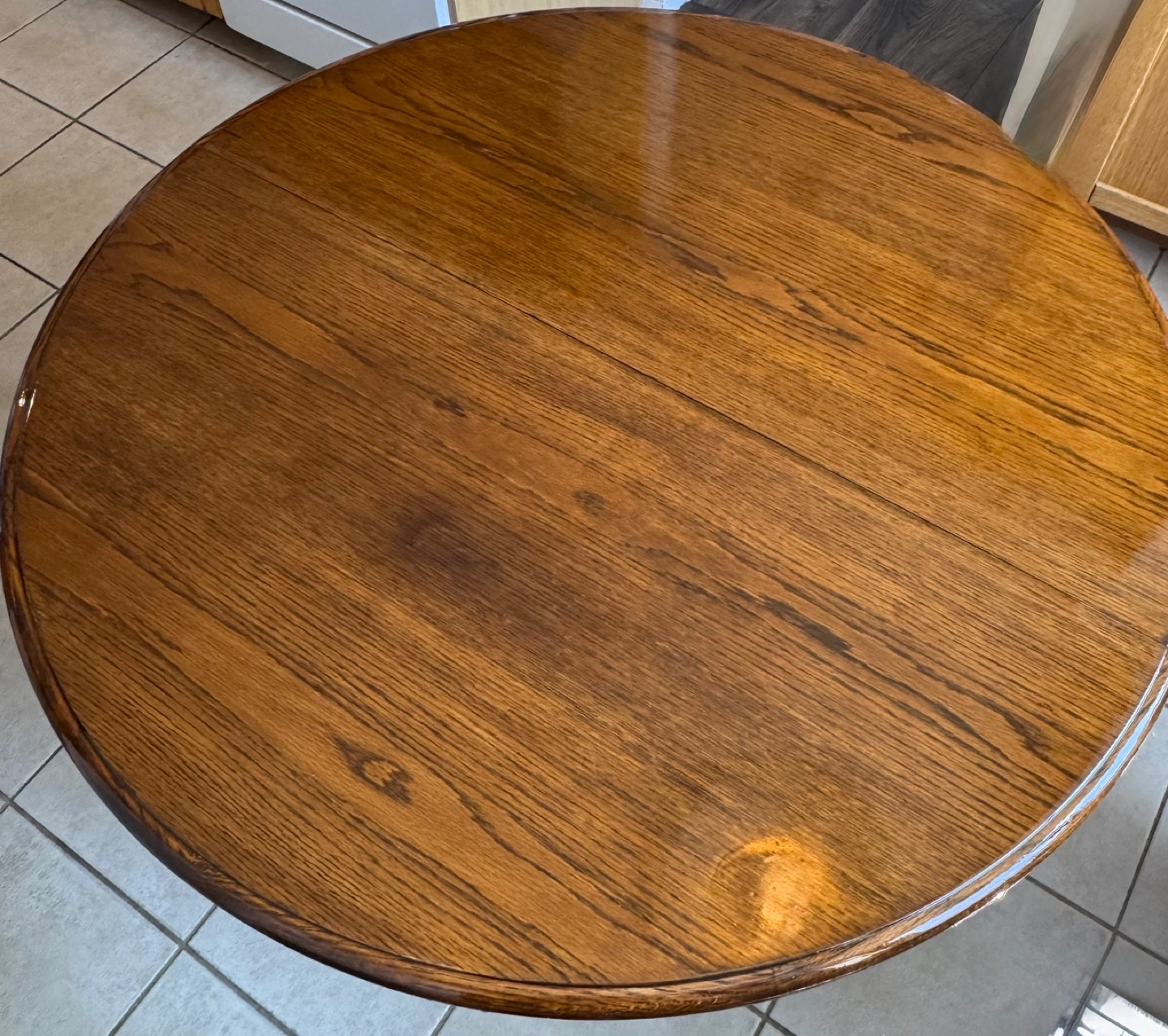 Gorgeous solid wood round table with pedestal base. Recently refinished for a warm, rich look. Varnish has a few rustic imperfections, giving it a unique farmhouse feel. Very sturdy and ready for its next home. Diameter: 42 inches Comes with 4 chairs