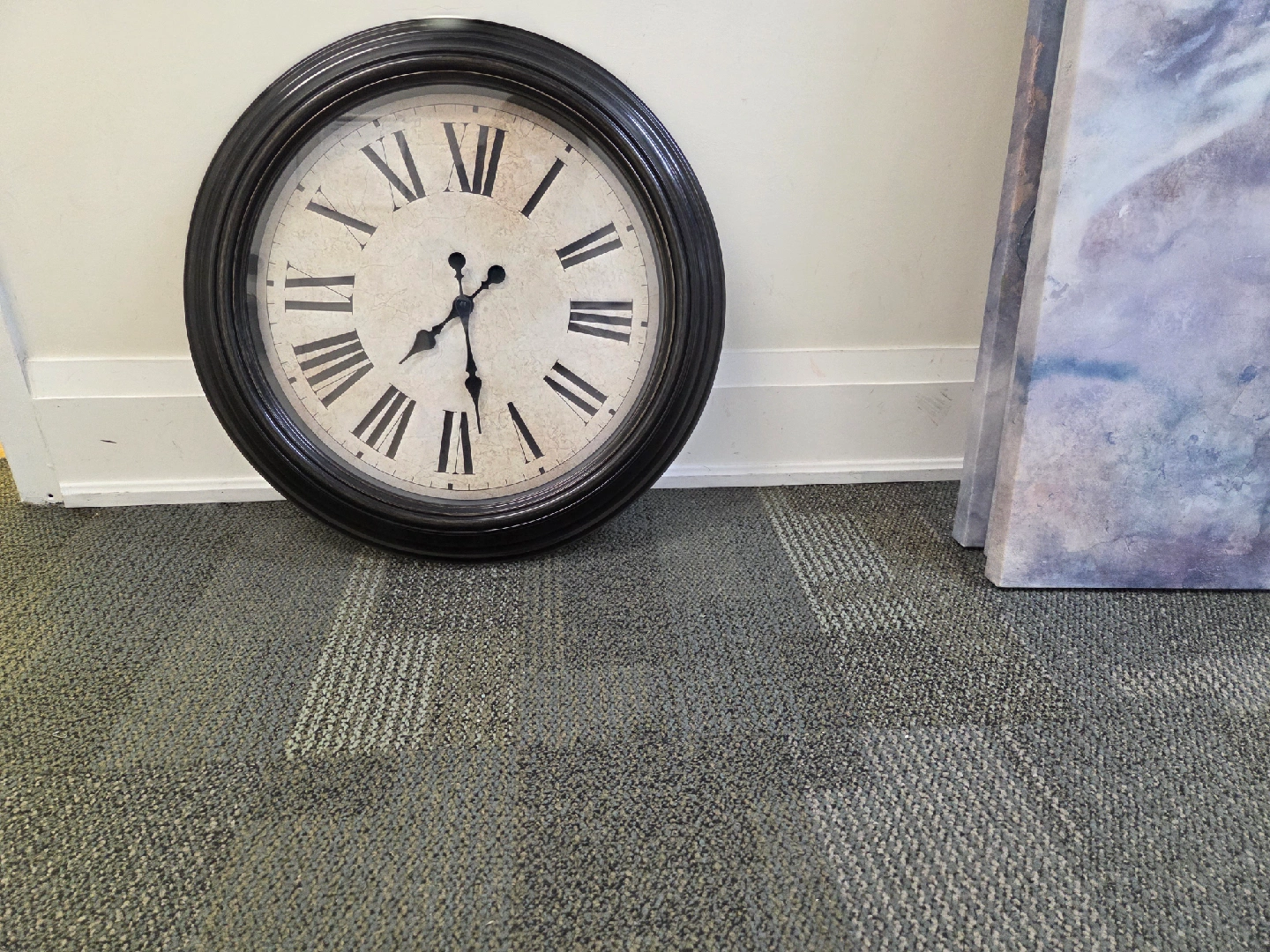 Selling a round wall clock. It has a black frame and a white face with Roman numerals. It would look great in any room!