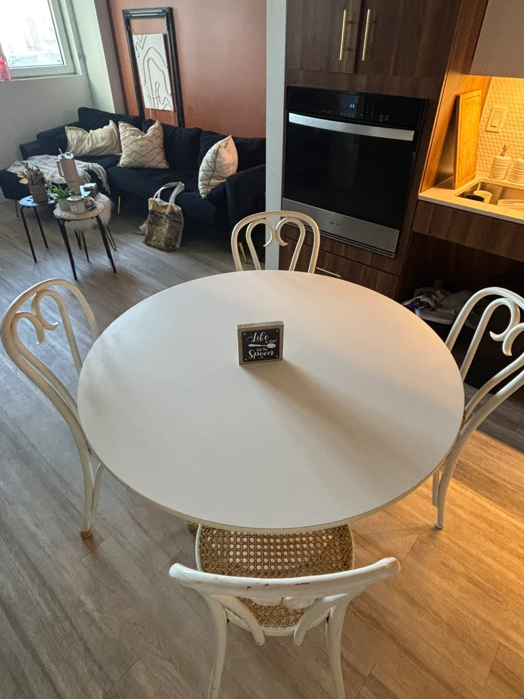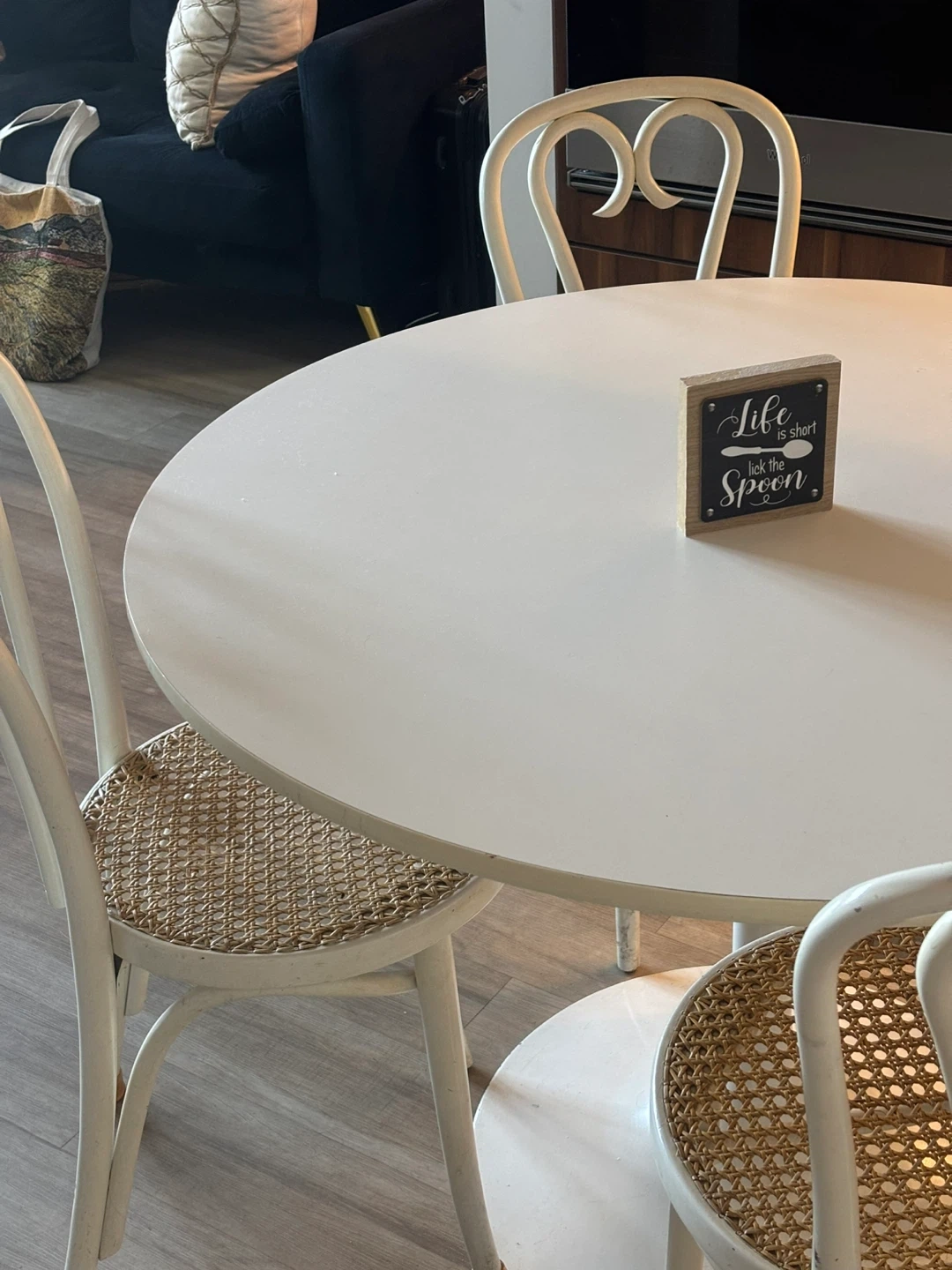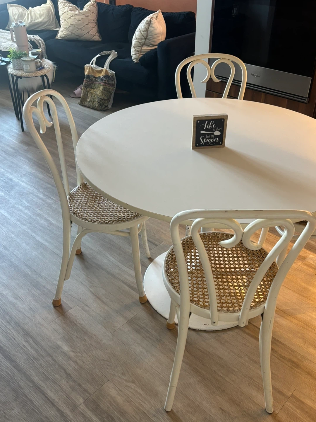 10Selling a round, white dining table that comes with four matching chairs. The chairs have a unique woven seat design. It's a great set for a smaller dining space or kitchen area!