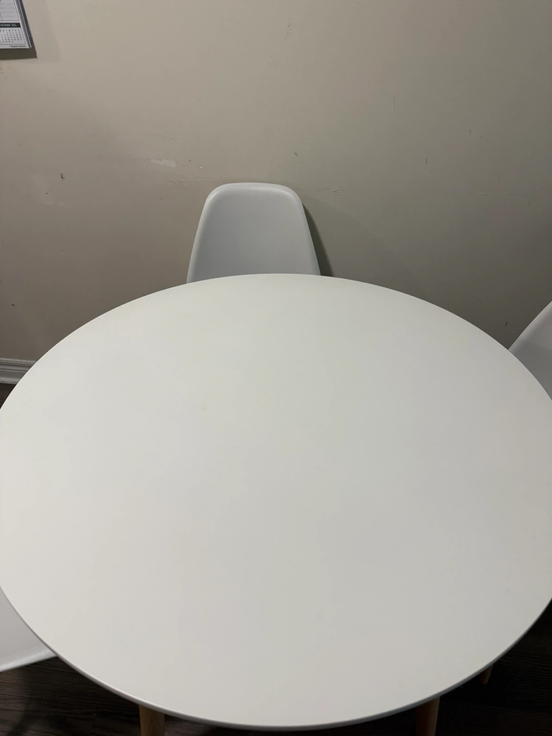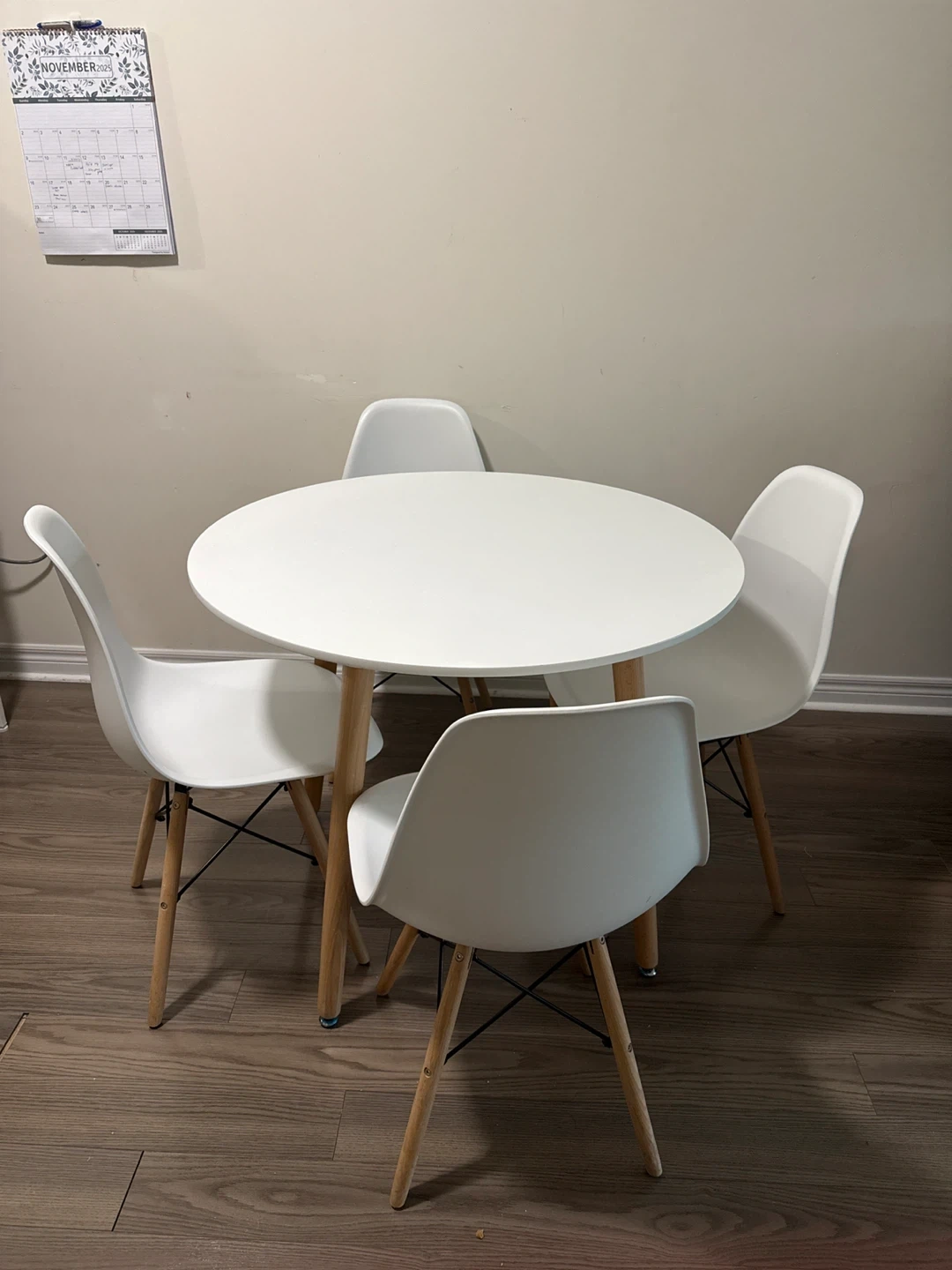 67Selling a round white dining table with four matching chairs. The set is in great condition and would look lovely in any dining space or kitchen. The chairs have a modern design with wooden legs, adding a touch of warmth to the set no scratches or stain .just like new selling due to moving purchased less than 2 yrs but not used much