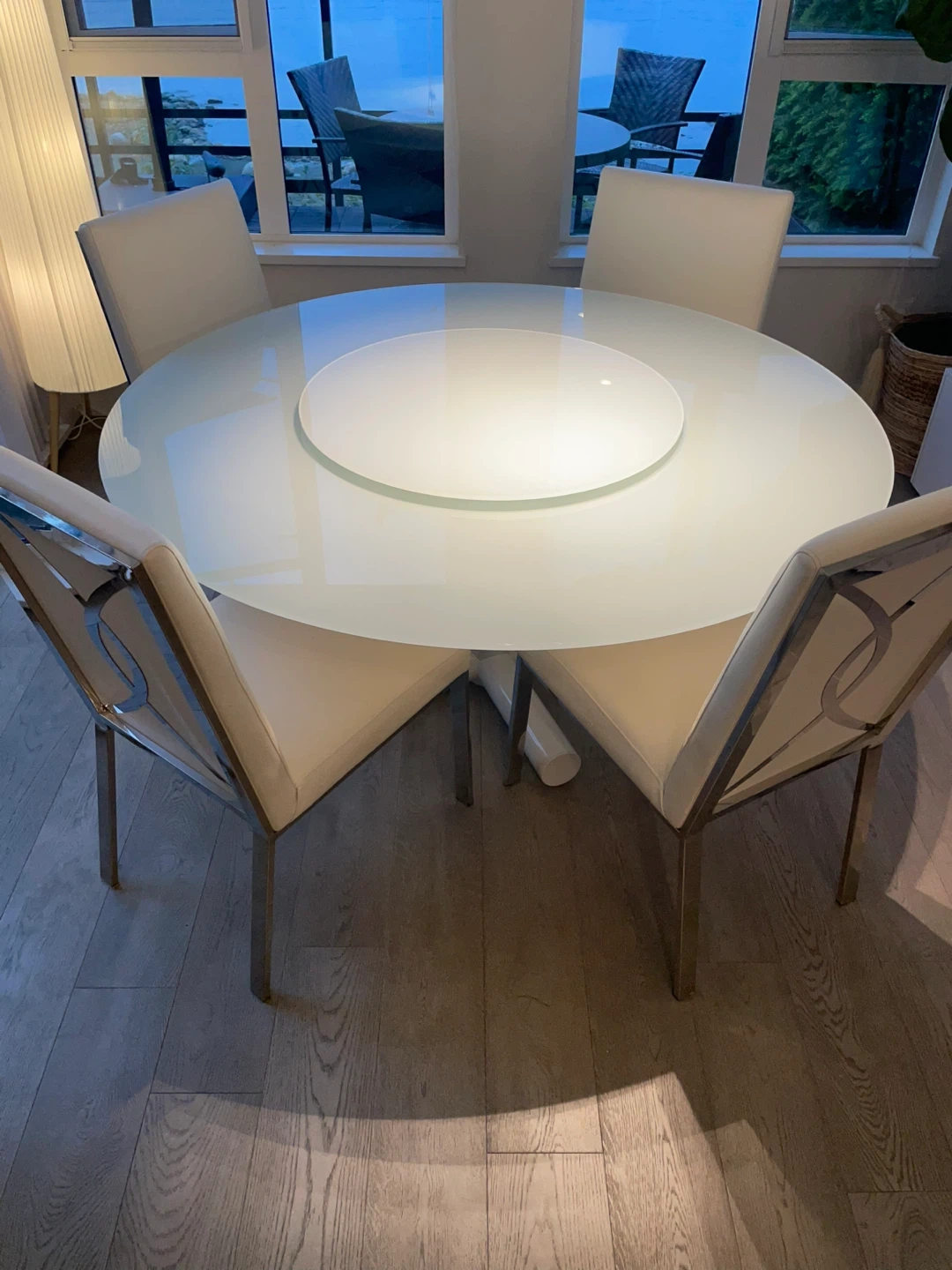 11Selling an Italian round white glass dining. The table features a removable rotating pedestal base. Perfect for family dinners or entertaining friends. Chairs are for sale too.