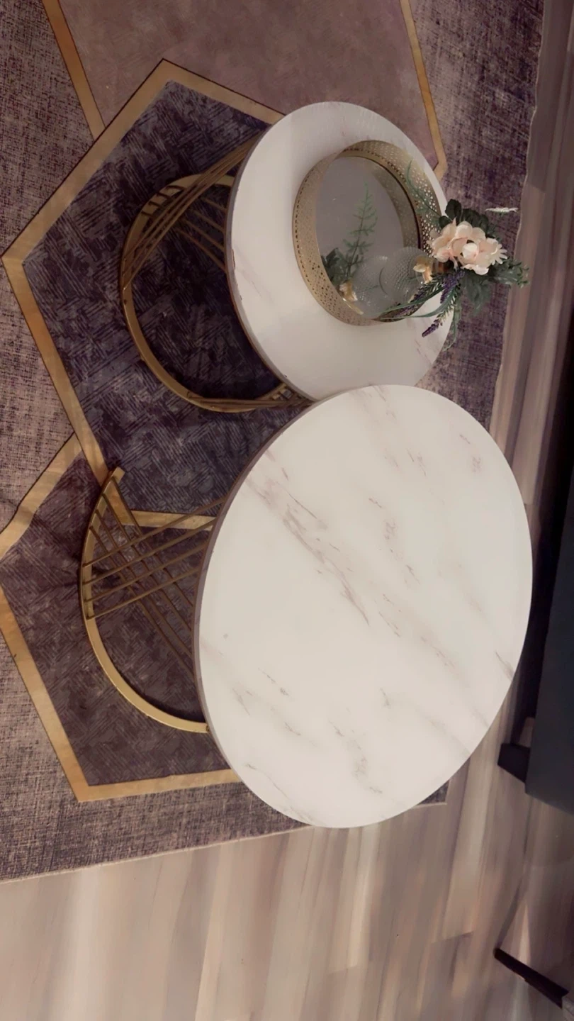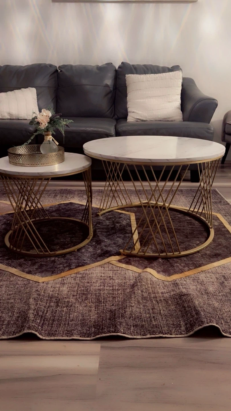 Selling a set of two stylish side tables! They feature a round, white marble top and a gold-coloured metal frame. These tables would add a touch of elegance to any living space. There are some minor signs of wear on the edges of the table tops.