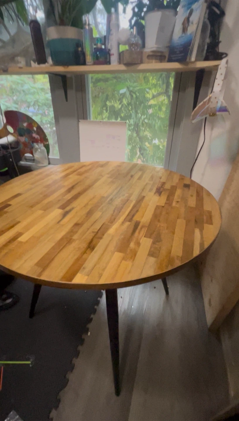 60Selling a round wood dining table. It has a unique design with a variety of wood tones creating a parquet-like pattern on the surface. The table features dark, slender legs that provide a nice contrast to the light-colored tabletop. It would be a great addition to any dining space!