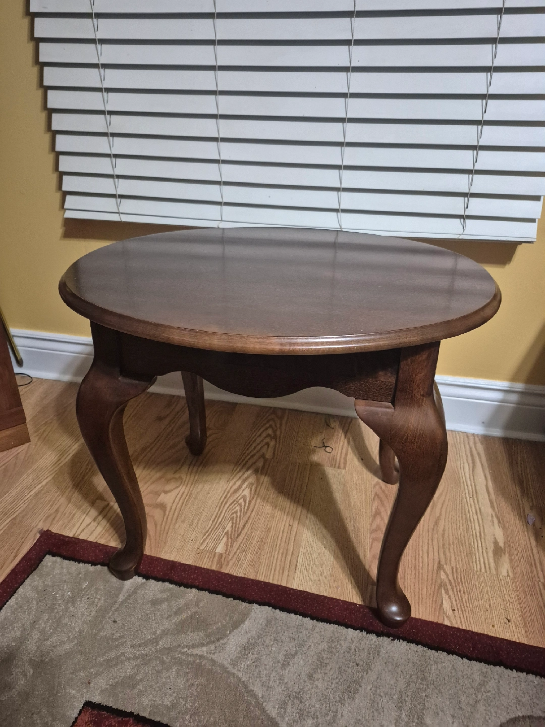 Selling a lovely round wooden accent table! It's in great shape and would look perfect in any living room or bedroom. The table features a classic design with elegantly curved legs and a smooth, polished surface. It's sturdy and ready to add a touch of warmth to your space