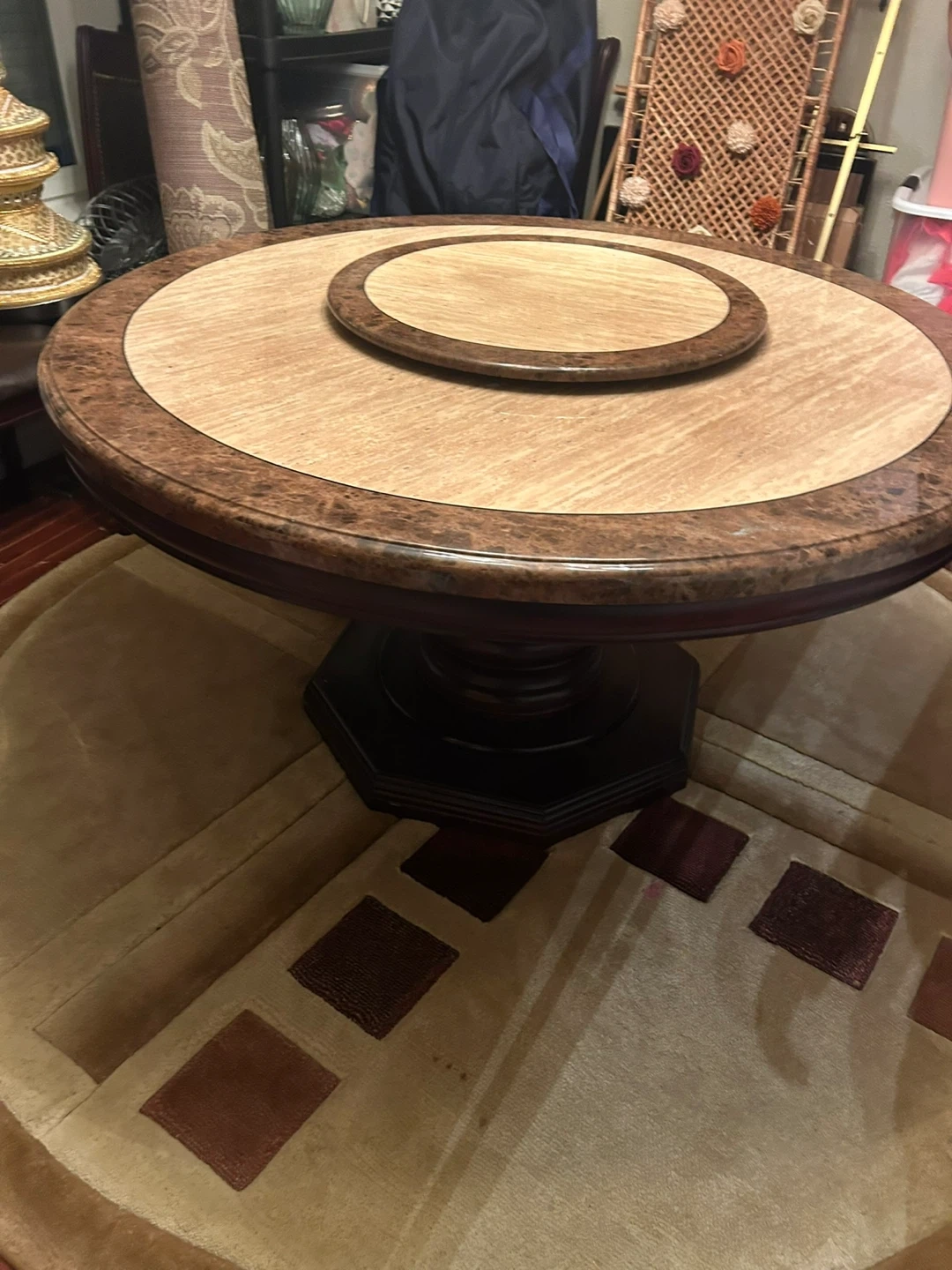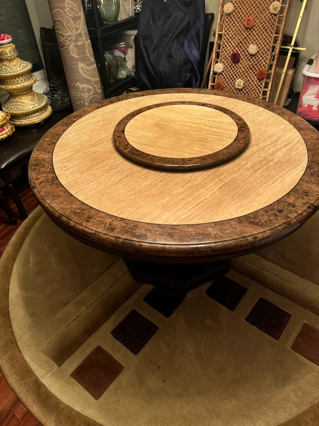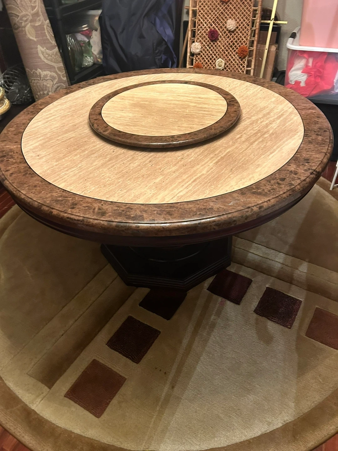 73Selling a round wooden dining table. It features a unique rotating centrepiece for easy serving and sharing. The table has a sturdy base and a warm, inviting finish, perfect for family dinners or gatherings with friends Chairs included
