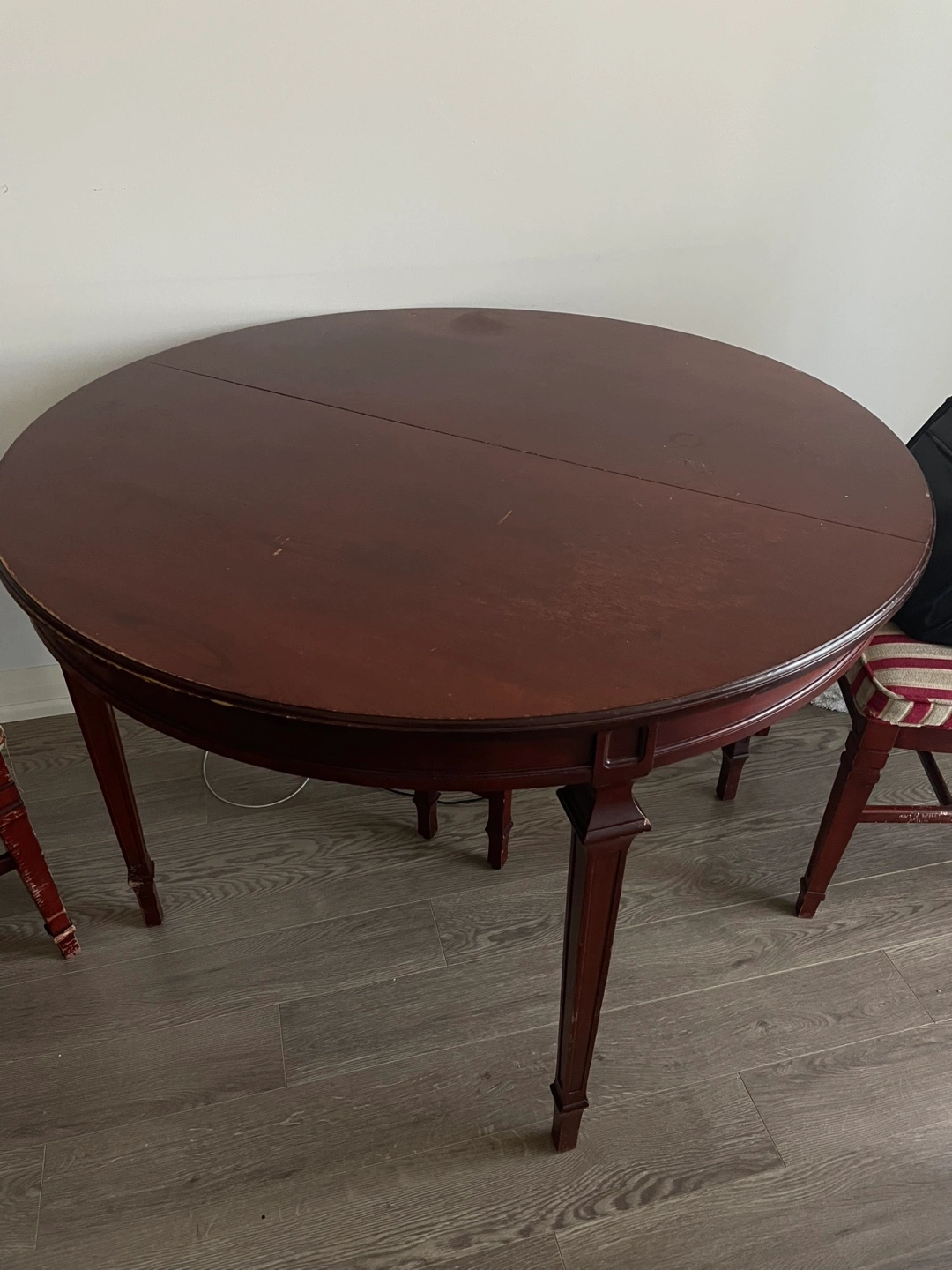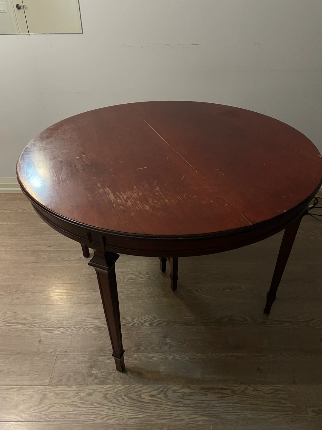 34Giving away a round wooden dining table. It has some wear and tear on the surface, as shown in the pictures. Perfect for a smaller dining area or kitchen nook!