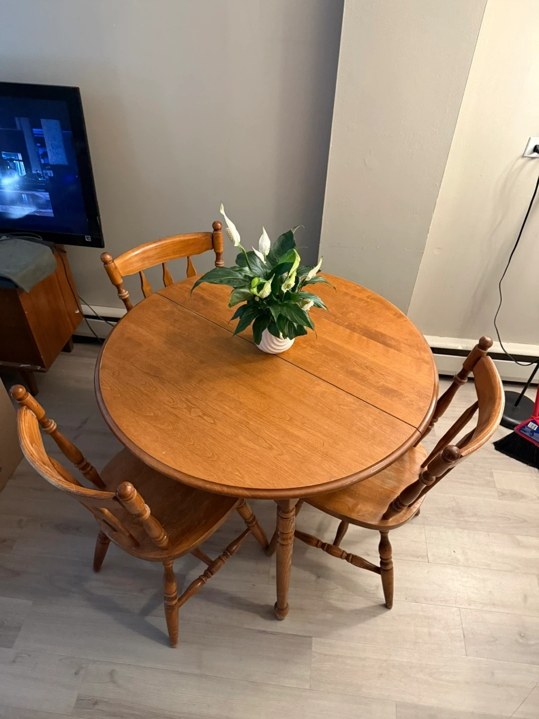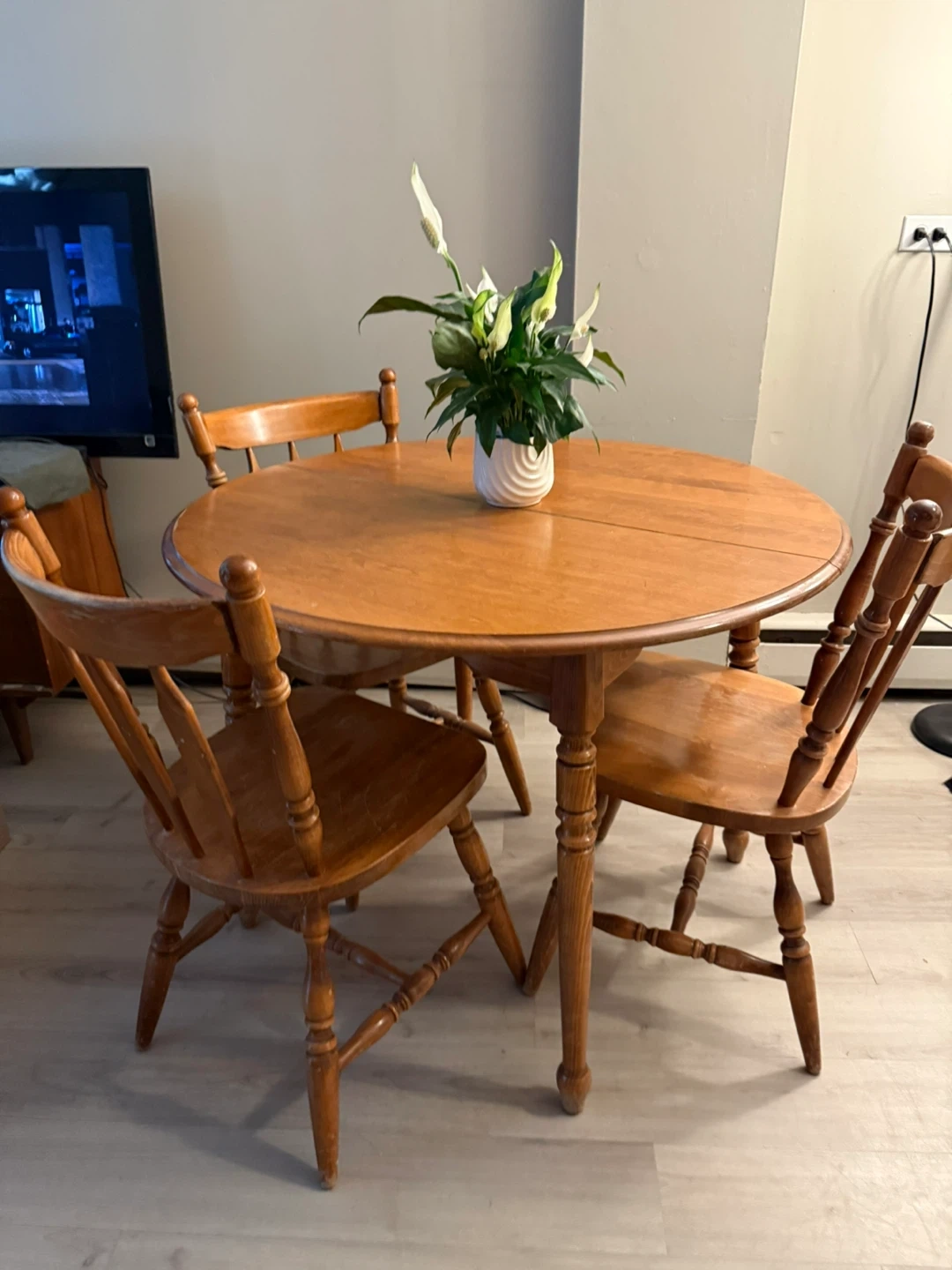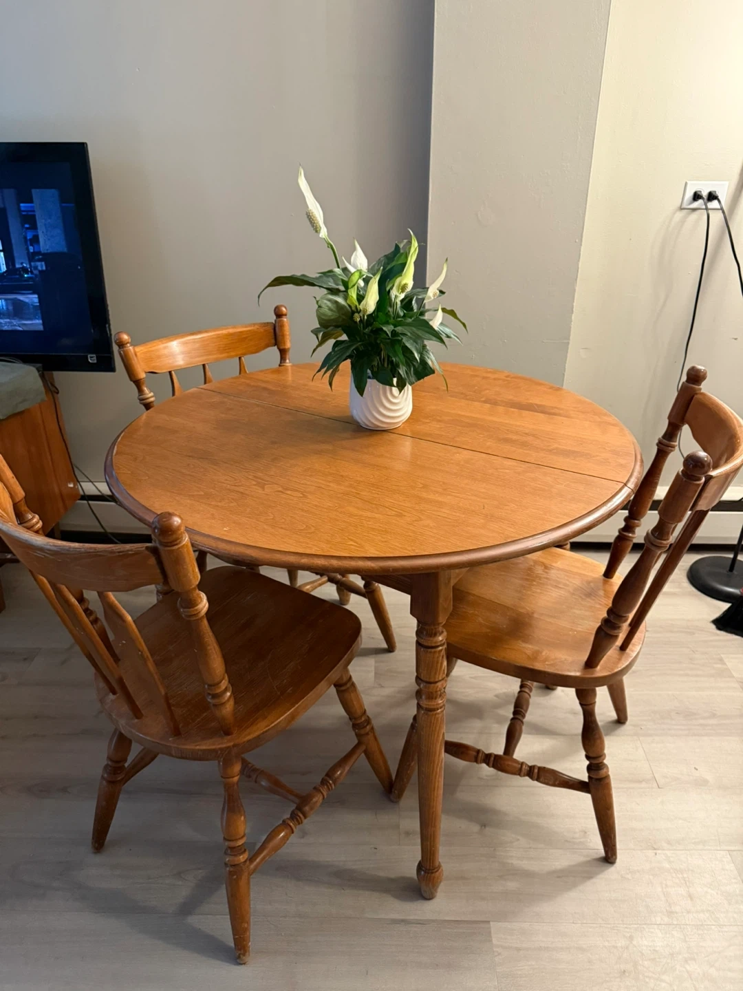 10Selling a round wooden dining table with three matching chairs. It's a great set for a small dining area or kitchen nook. The table has a classic design and the chairs are sturdy and comfortable. Perfect for cozy meals!