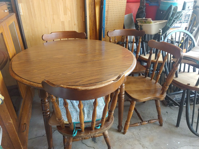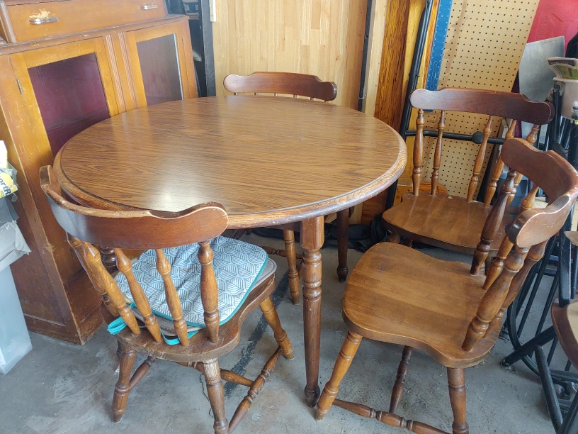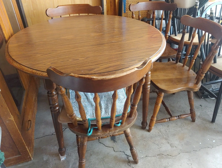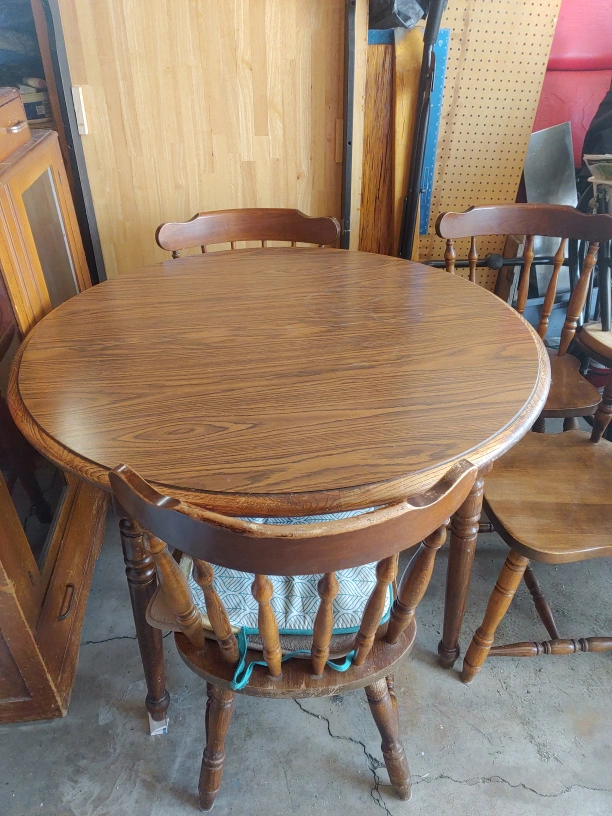 60Here's a round wooden dining table with four chairs. It has a classic look and would be great for a smaller dining area or kitchen. The set shows some signs of wear, but it's still sturdy and functional. Perfect for a cozy breakfast nook or a small family!