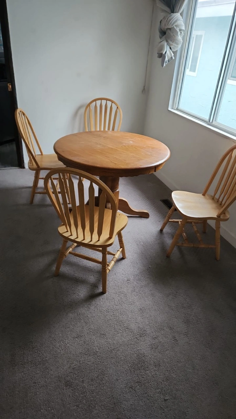Selling a round wooden dining table accompanied by four matching chairs. It's a great set for a smaller dining area or kitchen nook. The table and chairs are in good condition and ready for a new home!
