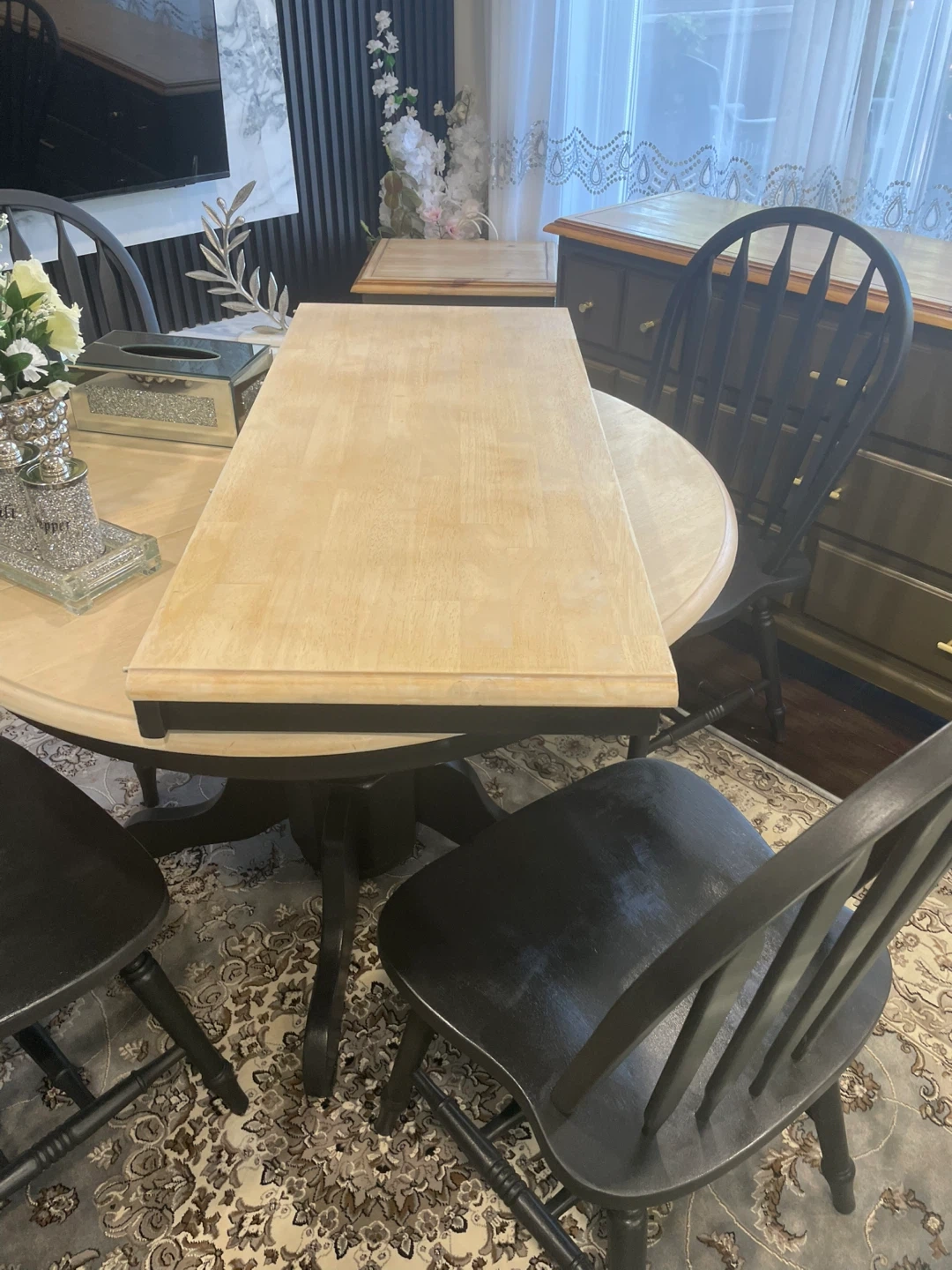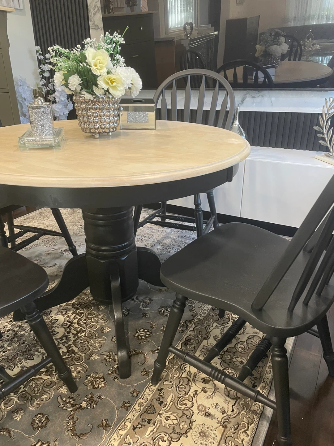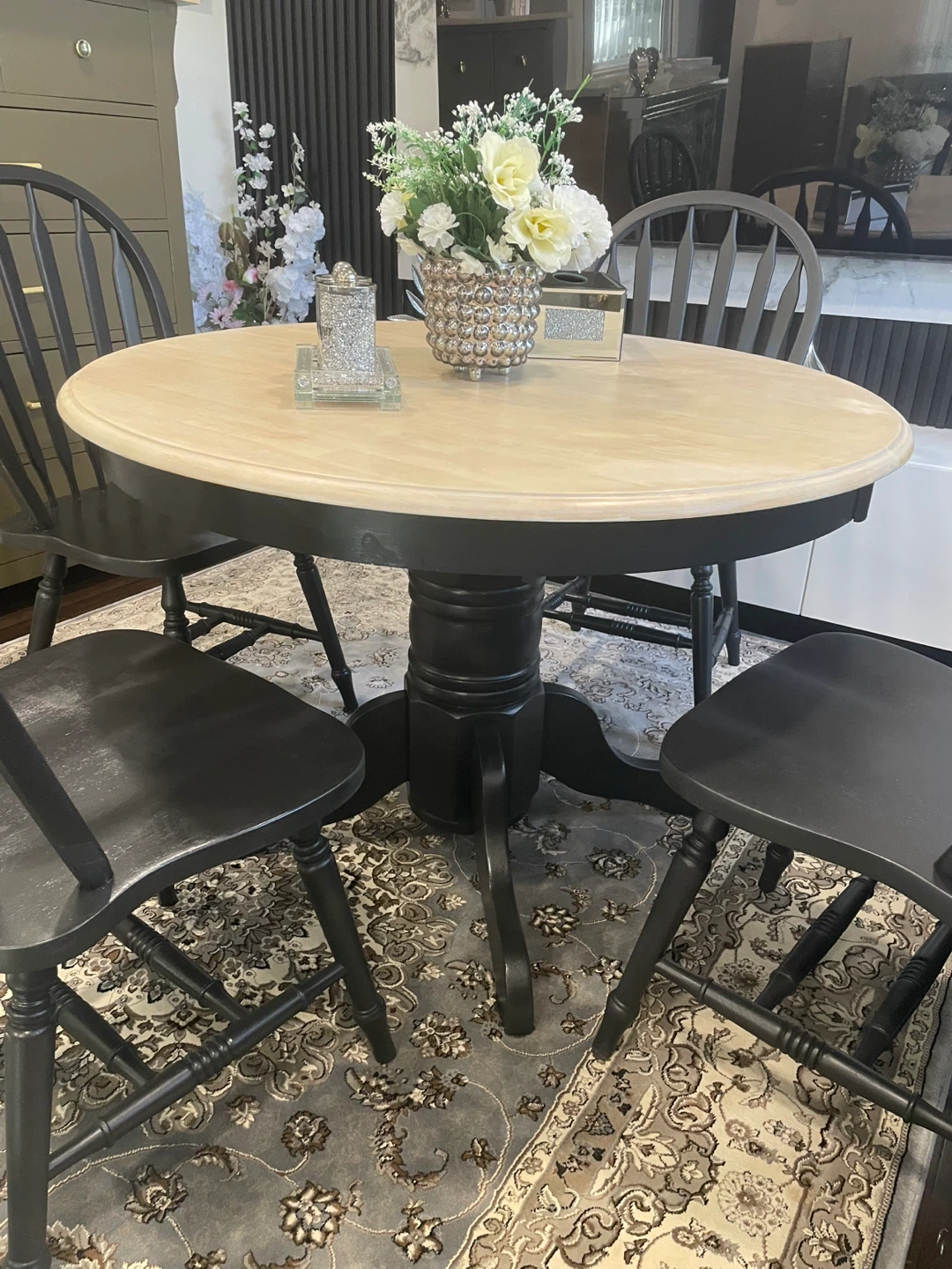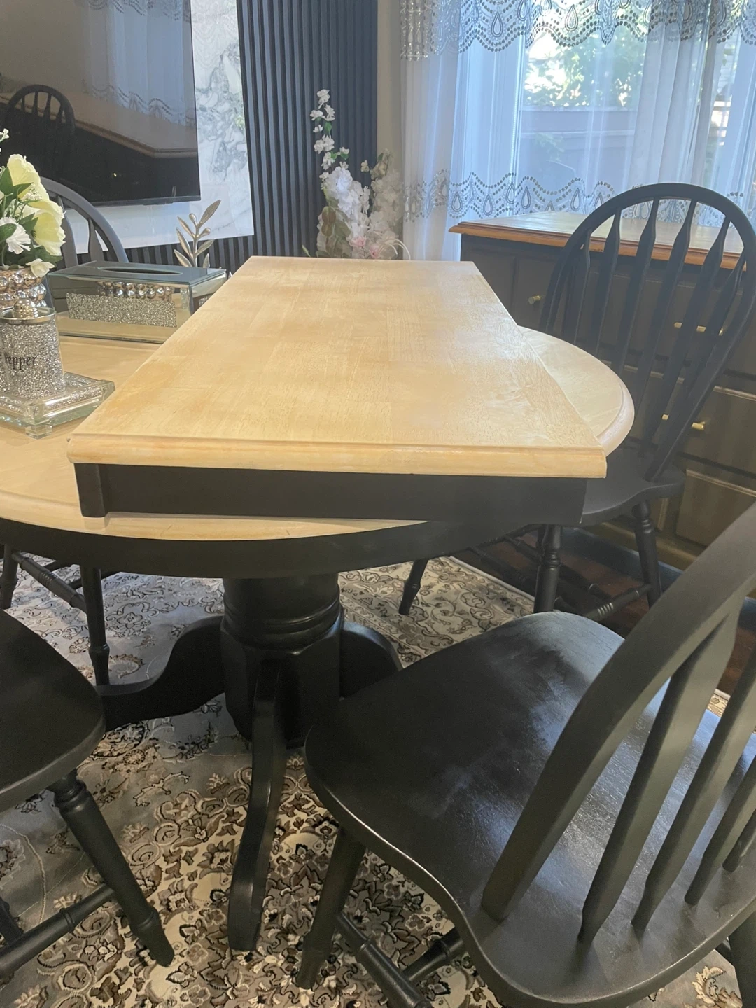 Selling a round dining table with a pedestal base and four chairs. It's an extendable table, so you can make it bigger if you need more space! The table is made of wood and painted with black legs and a light wood table top. The table is 48 inches in diameter when round and 66 inches long when extended