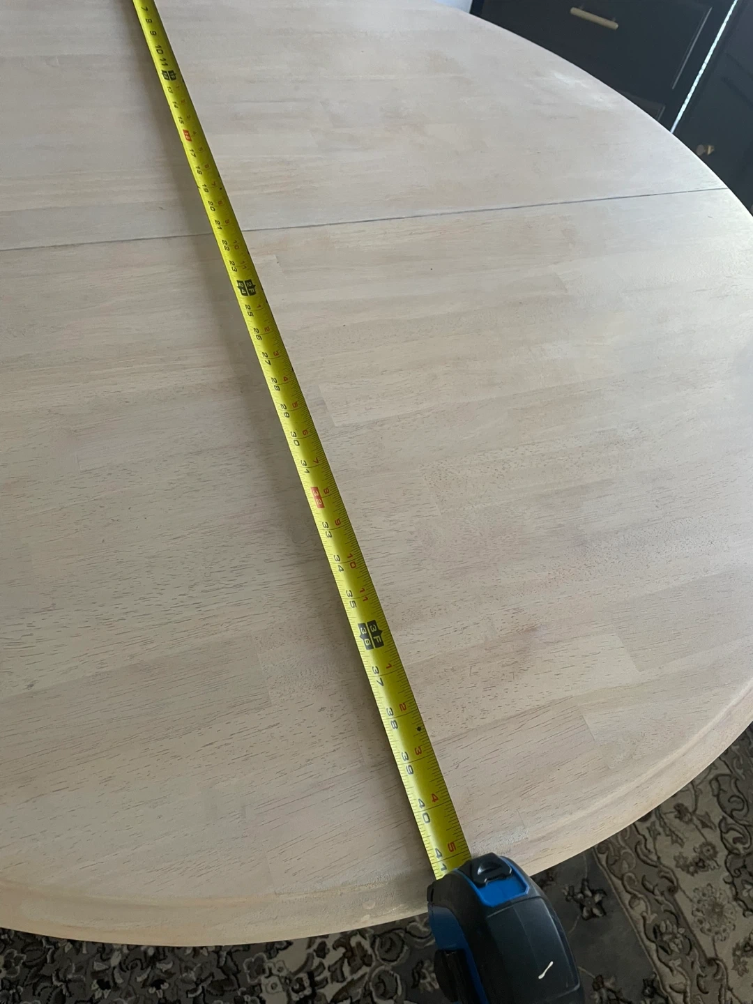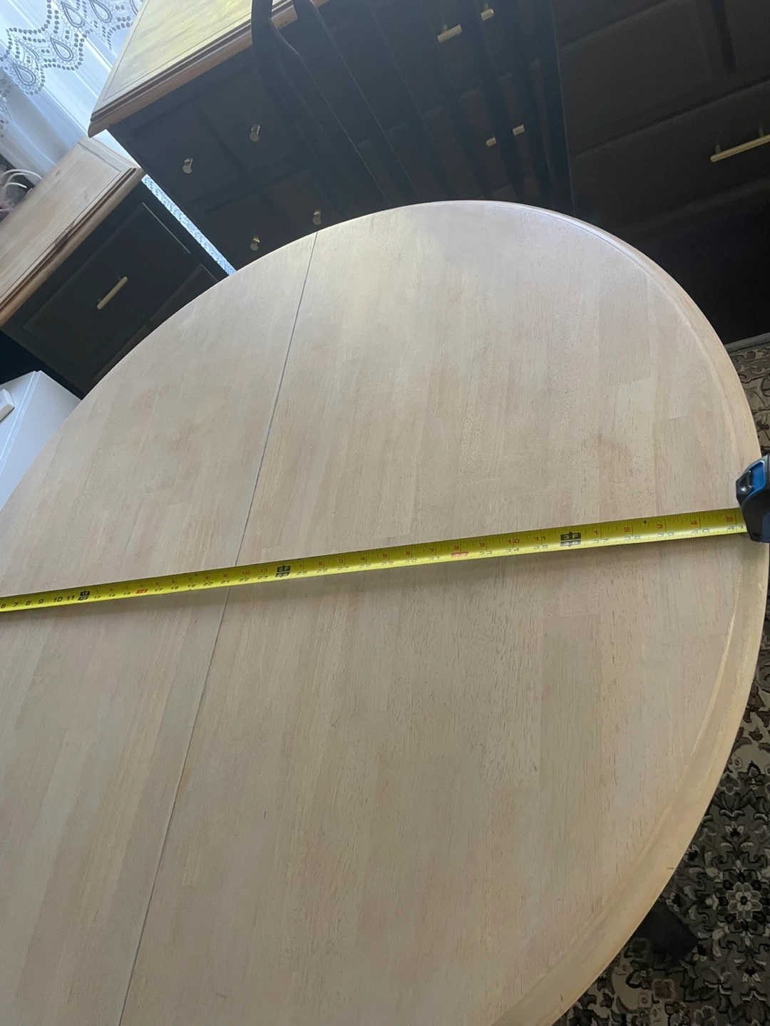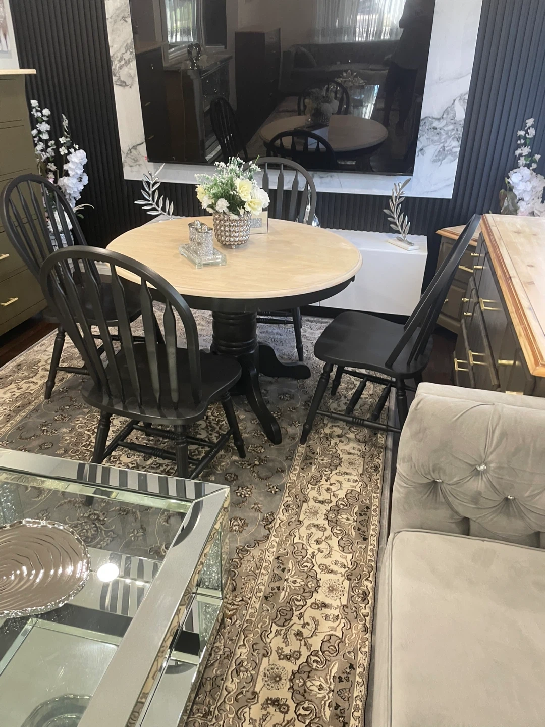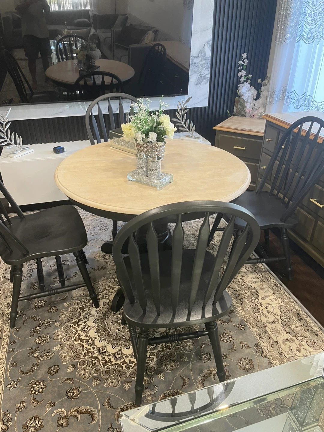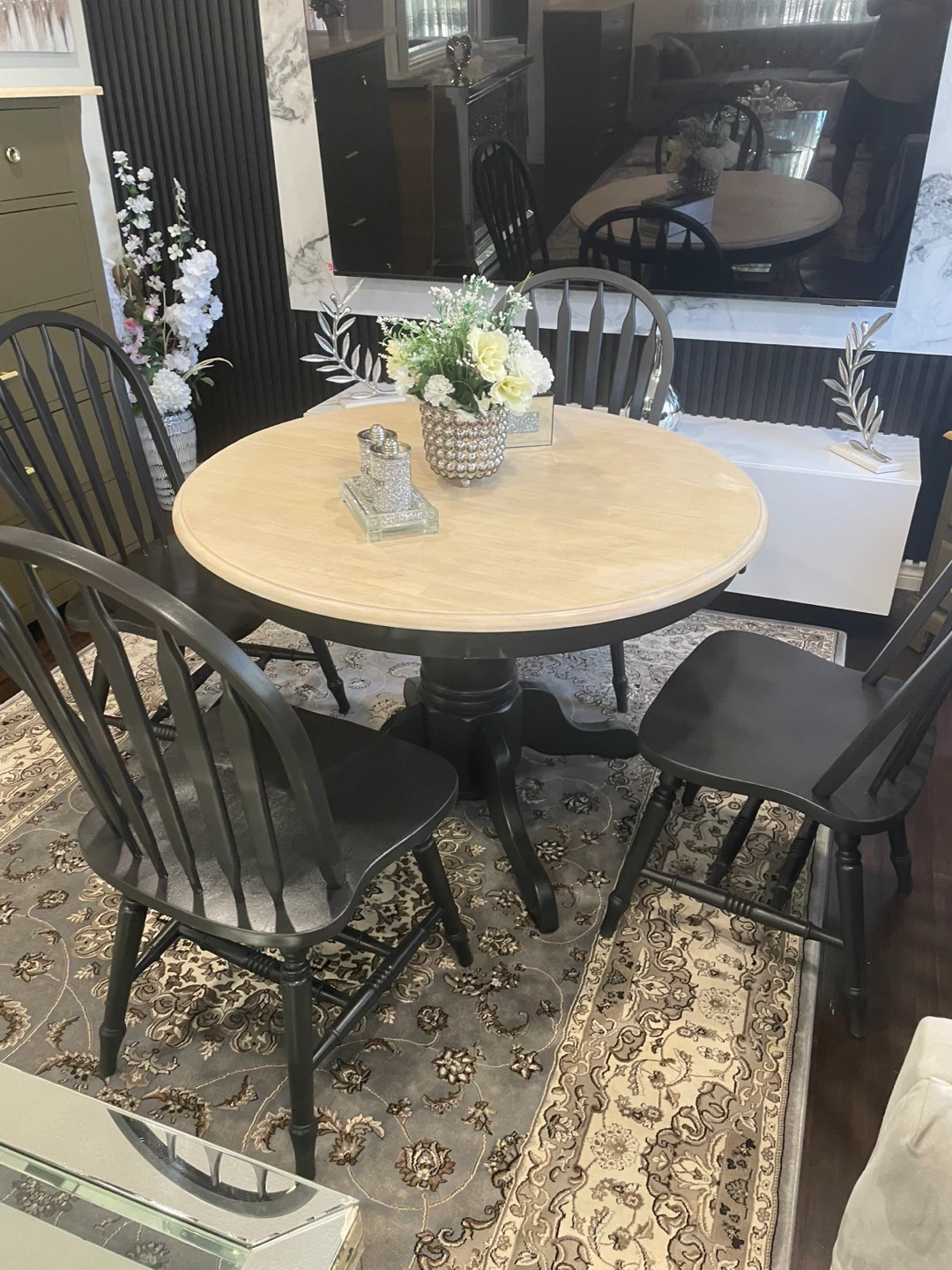 Selling a round dining table with a pedestal base and four chairs. It's an extendable table, so you can make it bigger if you need more space! The table is made of wood and painted with black legs and a light wood table top. The table is 48 inches in diameter when round and 66 inches long when extended